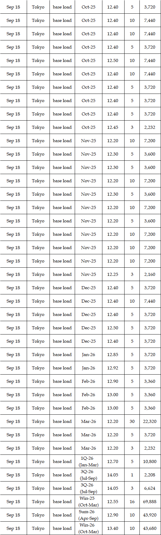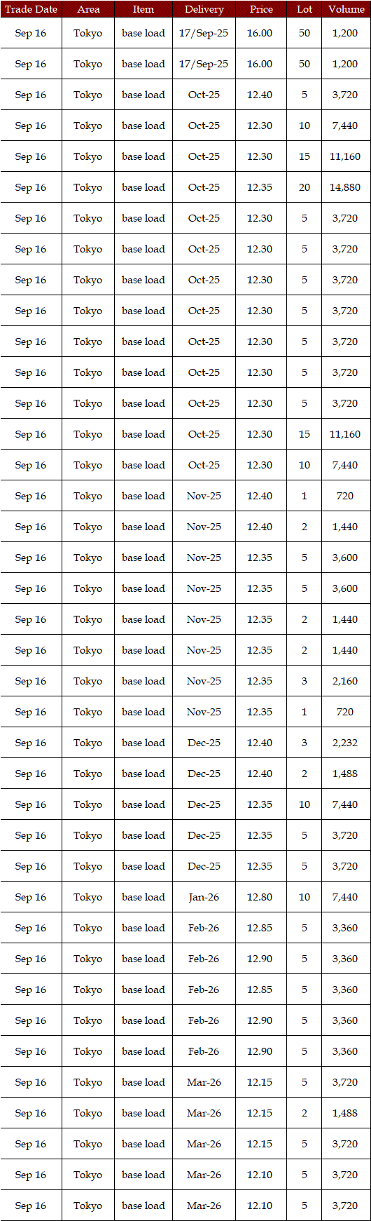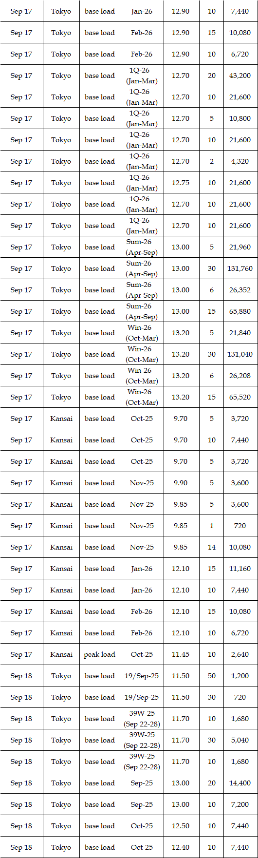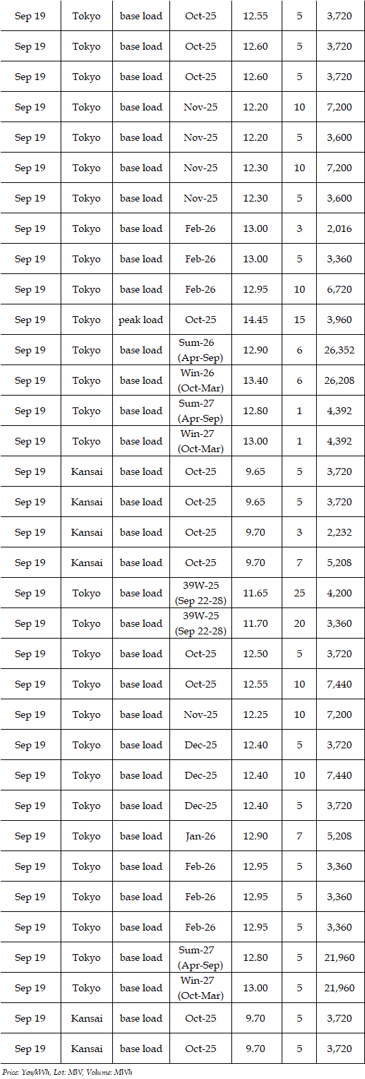 Deals reported on EEX (European Energy Exchange) during Sep 15-19 were as below. Prices for the fourth week of September were expected to hover at a level below the third week. Amid easing hot weather with around 30 degrees Celsius of high temperatures from Kanto to Kyushu through the week, demand for air conditioning would soften, affecting prices. Moreover, the expected sunny spell by the weather forecast would imply strong outputs from photovoltaic power plants and then force prices down. "Base load prices in Tokyo will hover at around Yen 12.00, and those in Kansai will be Yen 1.5 lower compared with those in Tokyo," a source at a power producer and supplier said.