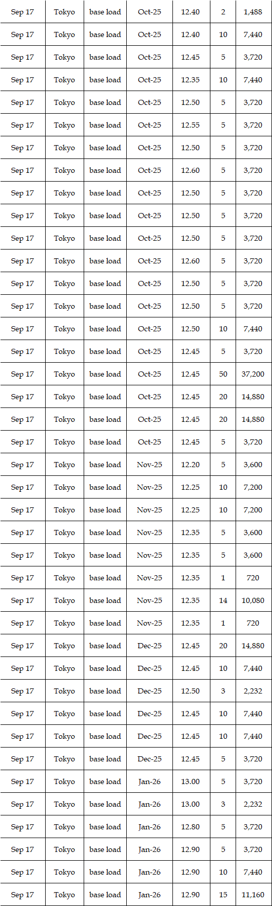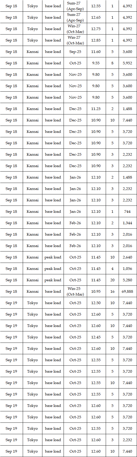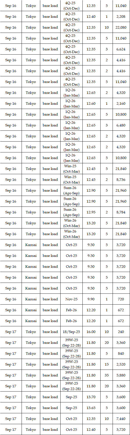 Deals reported on EEX (European Energy Exchange) during Sep 15-19 were as below. Prices for the fourth week of September were expected to hover at a level below the third week. Amid easing hot weather with around 30 degrees Celsius of high temperatures from Kanto to Kyushu through the week, demand for air conditioning would soften, affecting prices. Moreover, the expected sunny spell by the weather forecast would imply strong outputs from photovoltaic power plants and then force prices down. "Base load prices in Tokyo will hover at around Yen 12.00, and those in Kansai will be Yen 1.5 lower compared with those in Tokyo," a source at a power producer and supplier said.