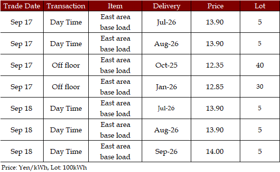The 24-hour spot average between Tokyo and Kansai, a major market area in East and West Japan, was Yen 0.84 on Sep 15, Yen 0.80 on Sep 16, Yen 5.12 on Sep 17, and Yen 1.74 on Sep 19 in favor of the East; on Sep 18, Yen 0.76 in favor of the West.