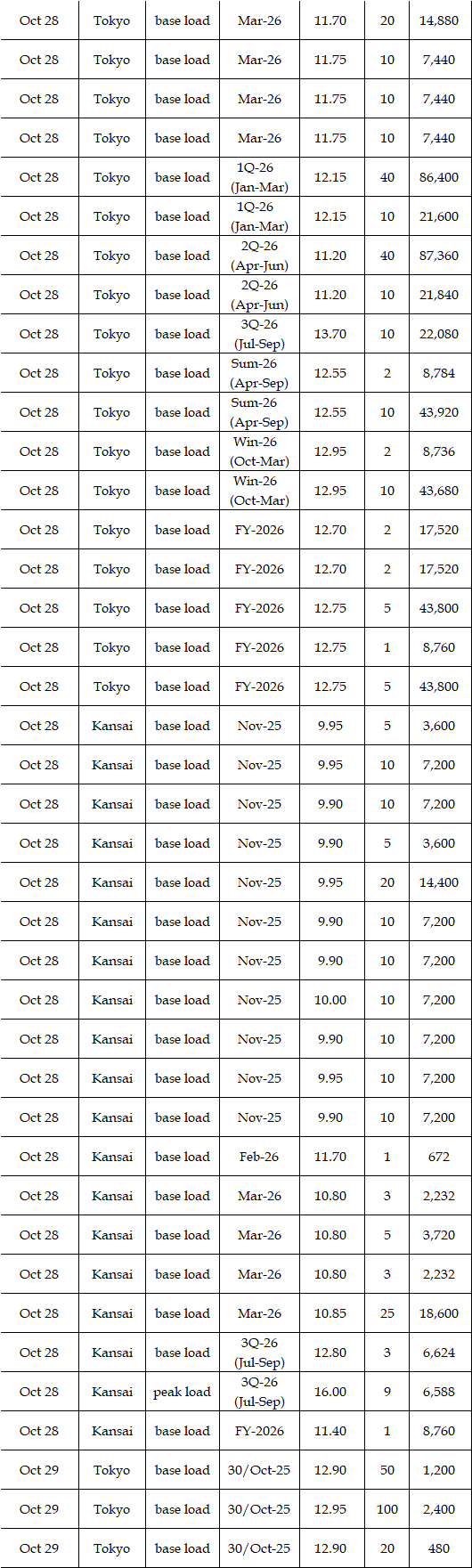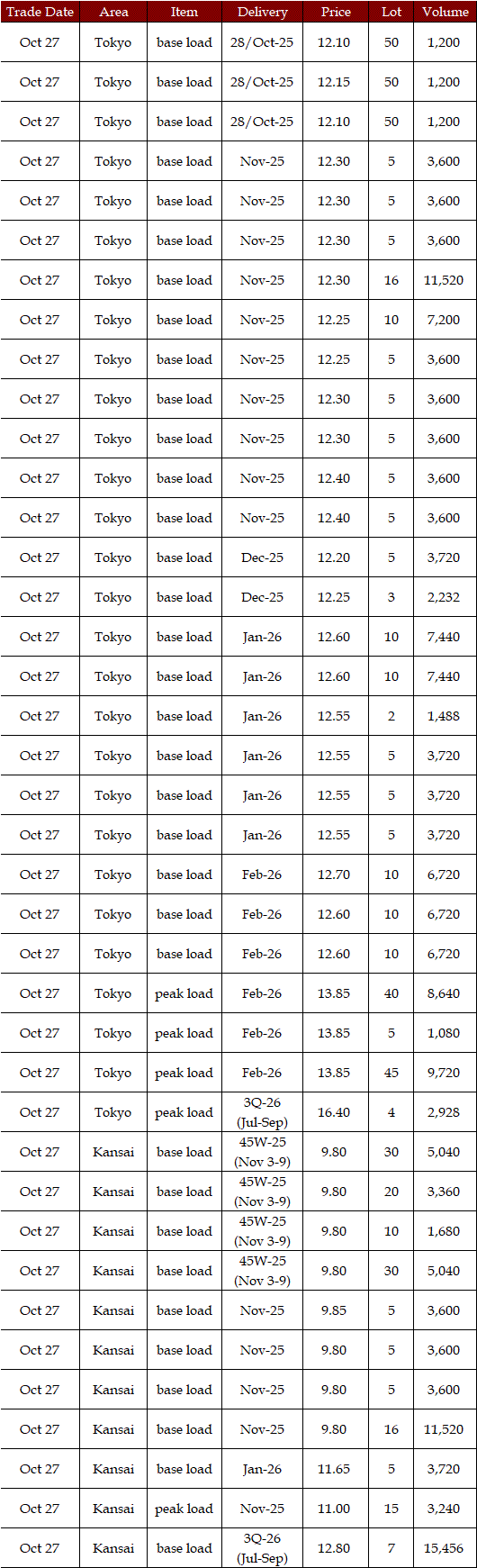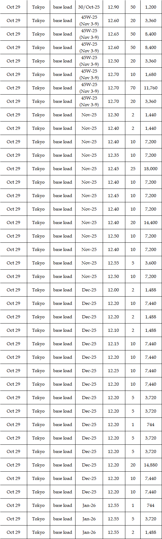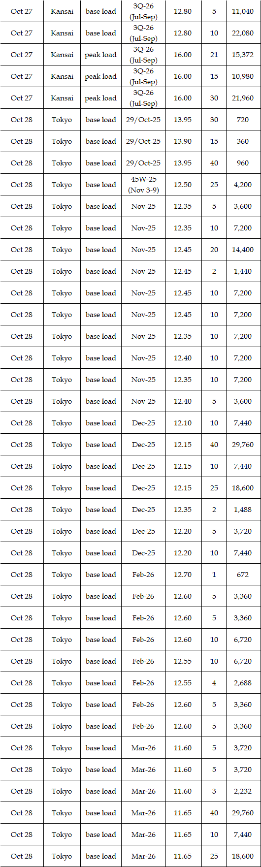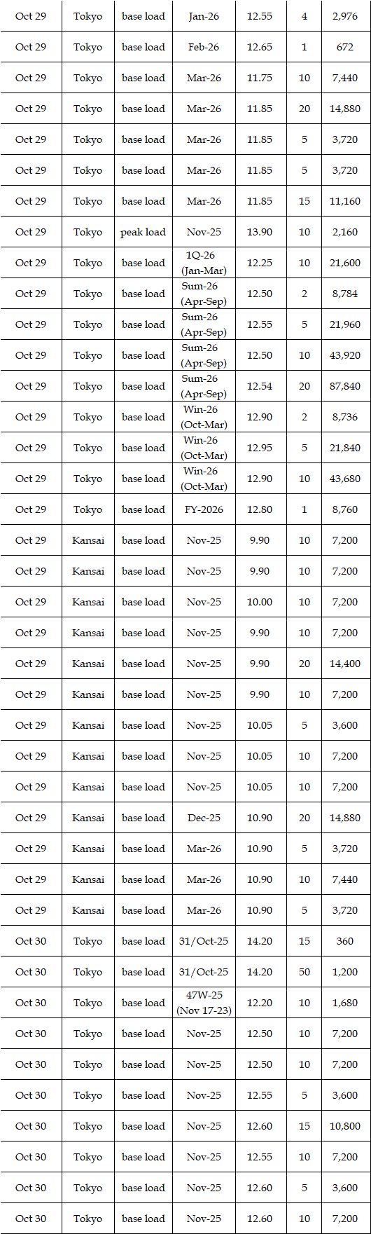 The actual highest price during the week was at Yen 32.54 in Hokkaido on Oct 29; the actual lowest price during the week was at Yen 0.01 in Kyushu on Oct 27, in Shikoku & Kyushu on Oct 28, in Chugoku, Shikoku, & Kyushu on Oct 29, and in Kyushu on Oct 30.
