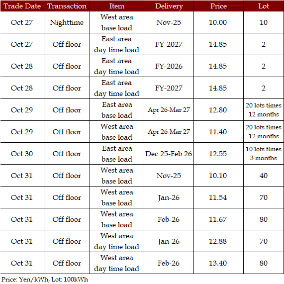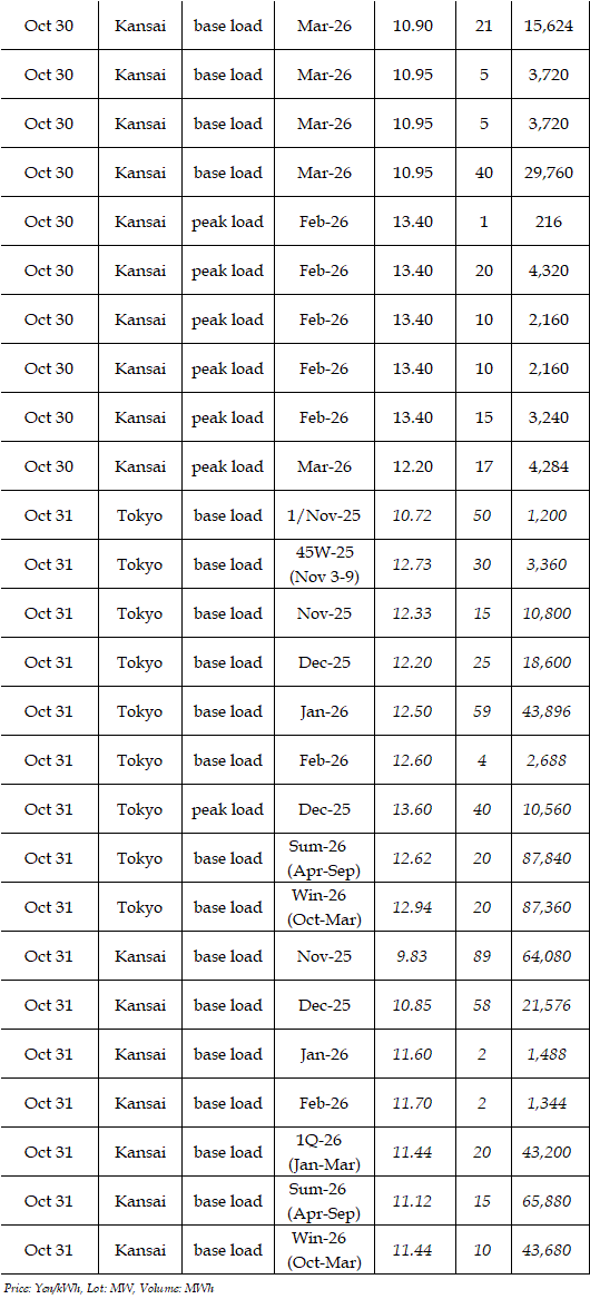 The spread of the 24-hour spot average between Tokyo and Kansai, a major market area in East and West Japan, was Yen 3.34 on Oct 27, Yen 3.64 on Oct 28, Yen 3.57 on Oct 29, Yen 2.20 on Oct 30, and Yen 1.13 on Oct 31 in favor of the East.