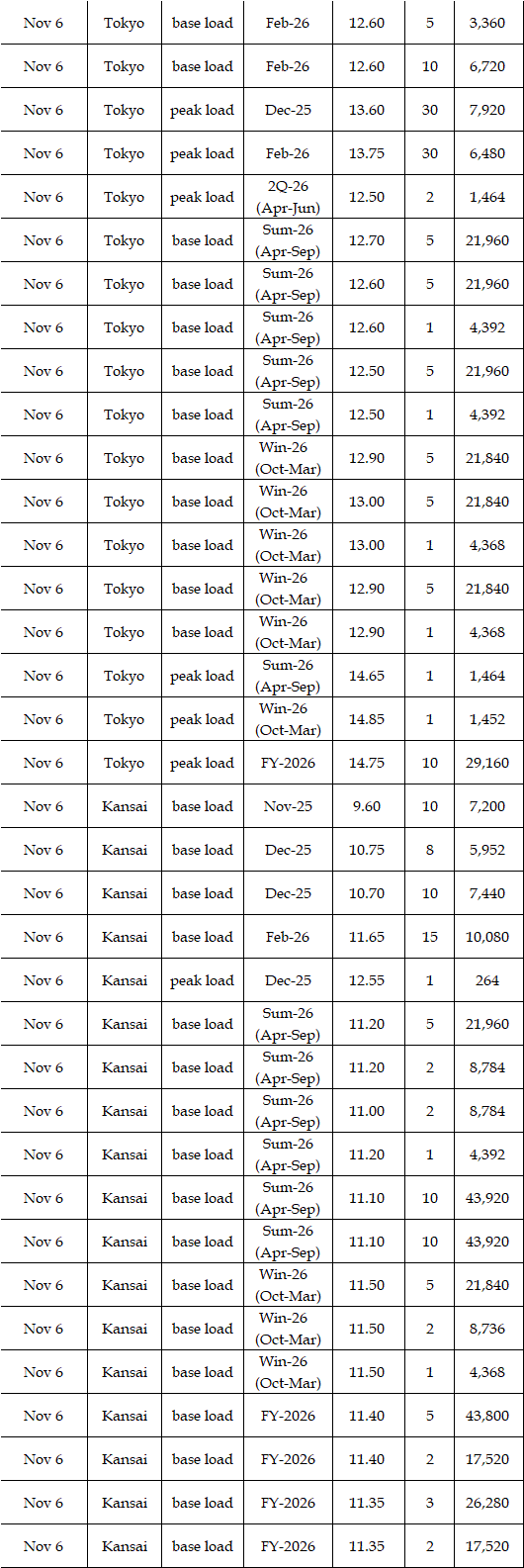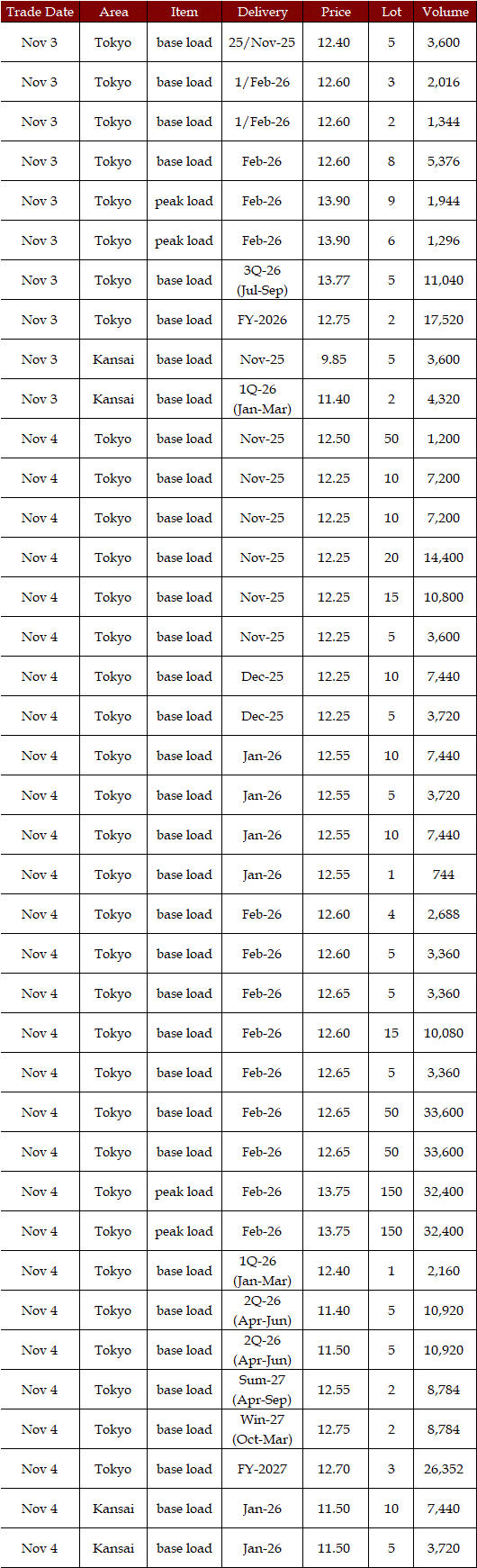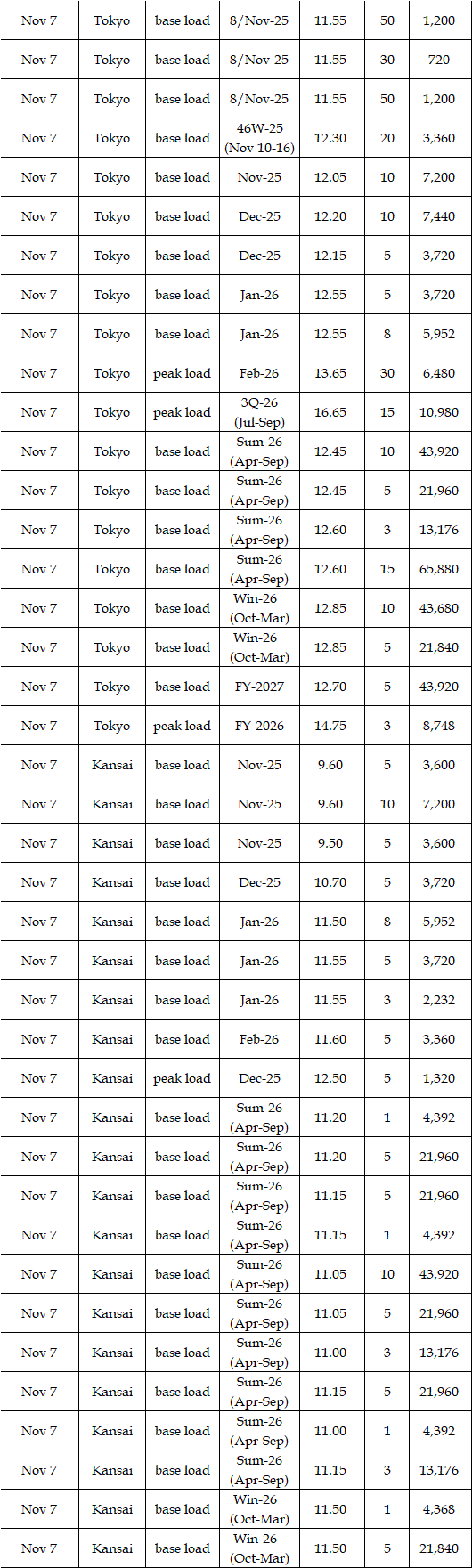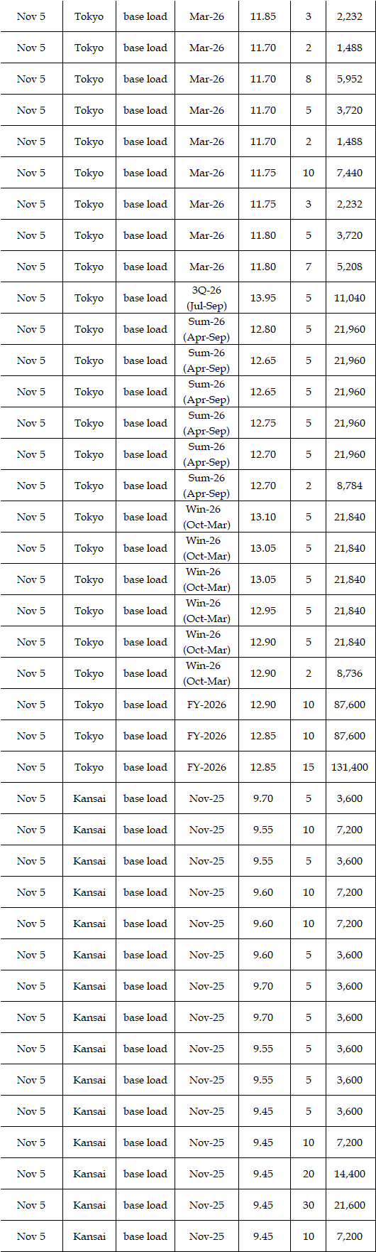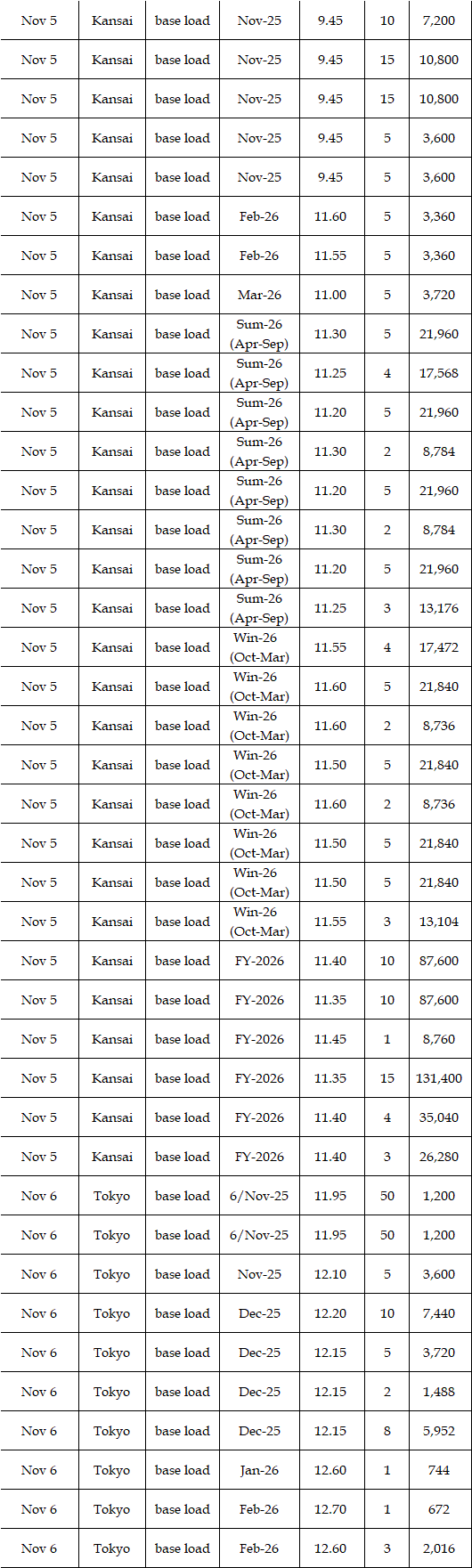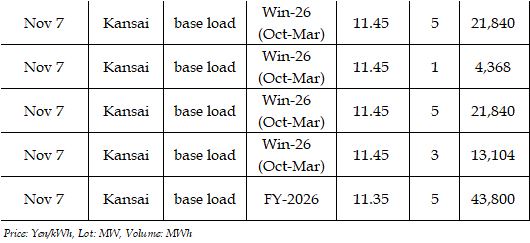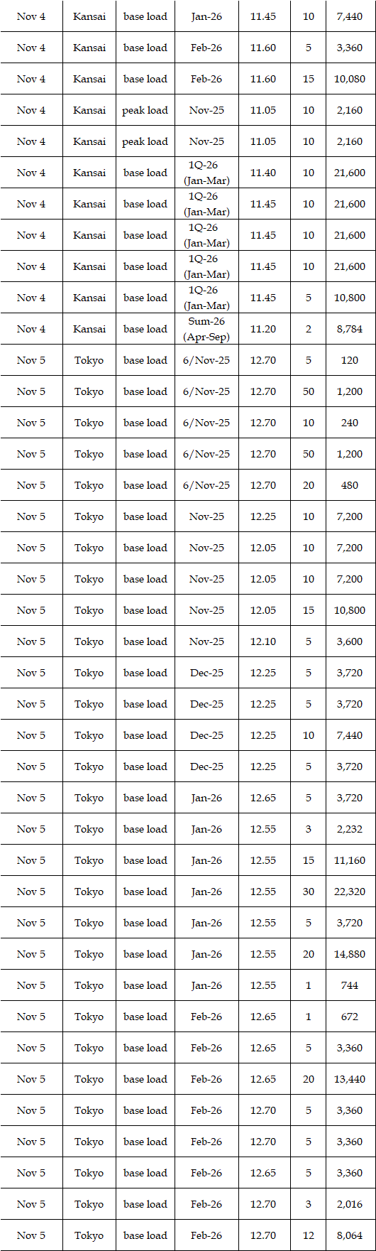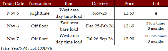 The spread of the 24-hour spot average between Tokyo and Kansai, a major market area in East and West Japan, was Yen 2.98 on Nov 3, Yen 1.15 on Nov 4, Yen 2.27 on Nov 5, Yen 3.25 on Nov 6, and Yen 0.83 on Nov 7 in favor of the East.