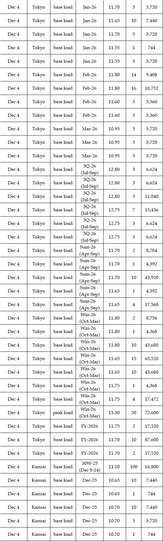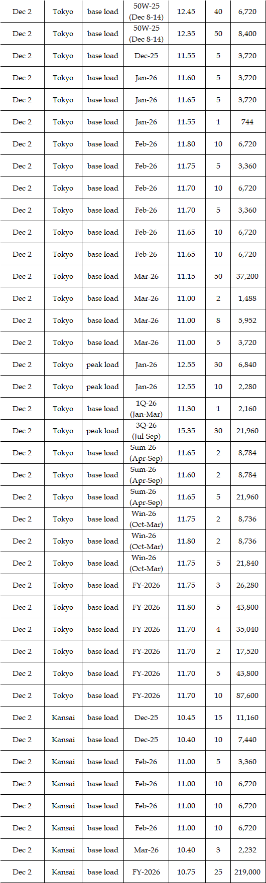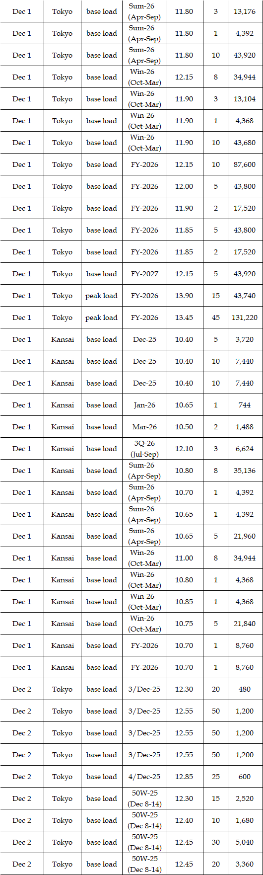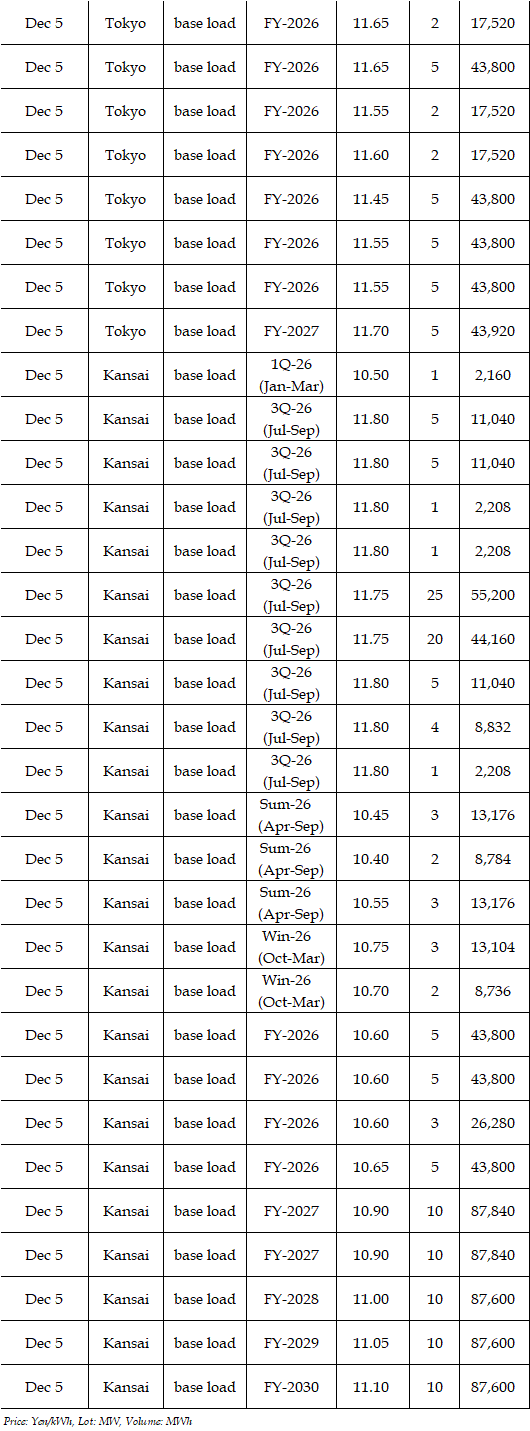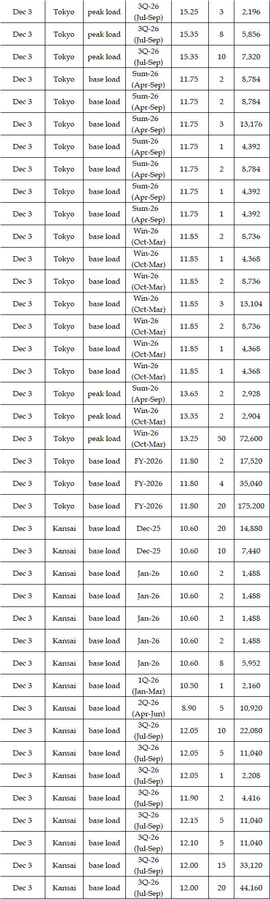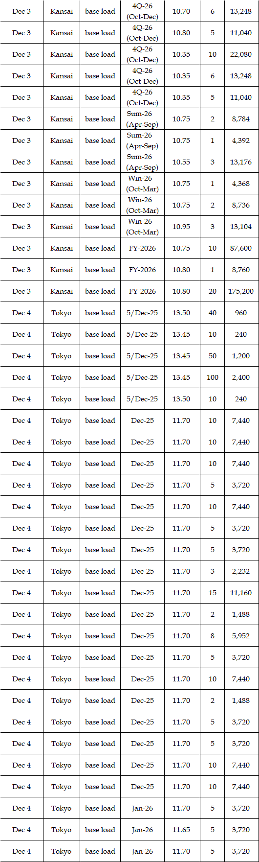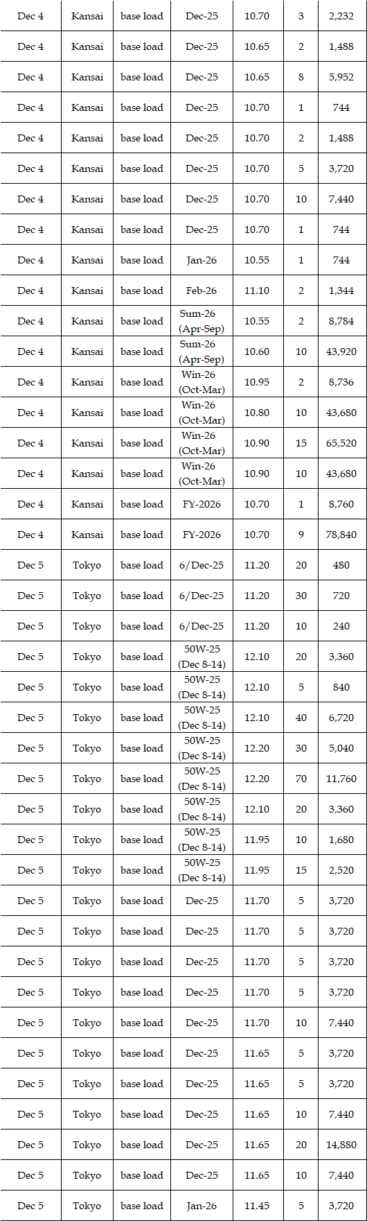 The spread of the 24-hour spot average between Tokyo and Kansai, a major market area in East and West Japan, was Yen 0.95 on Dec 1, Yen 1.44 on Dec 2, and Yen 0.56 on Dec 3 in favor of the East, followed by Yen 0.27 on Dec 4 and Yen 0.21 on Dec 5 in favor of the West.