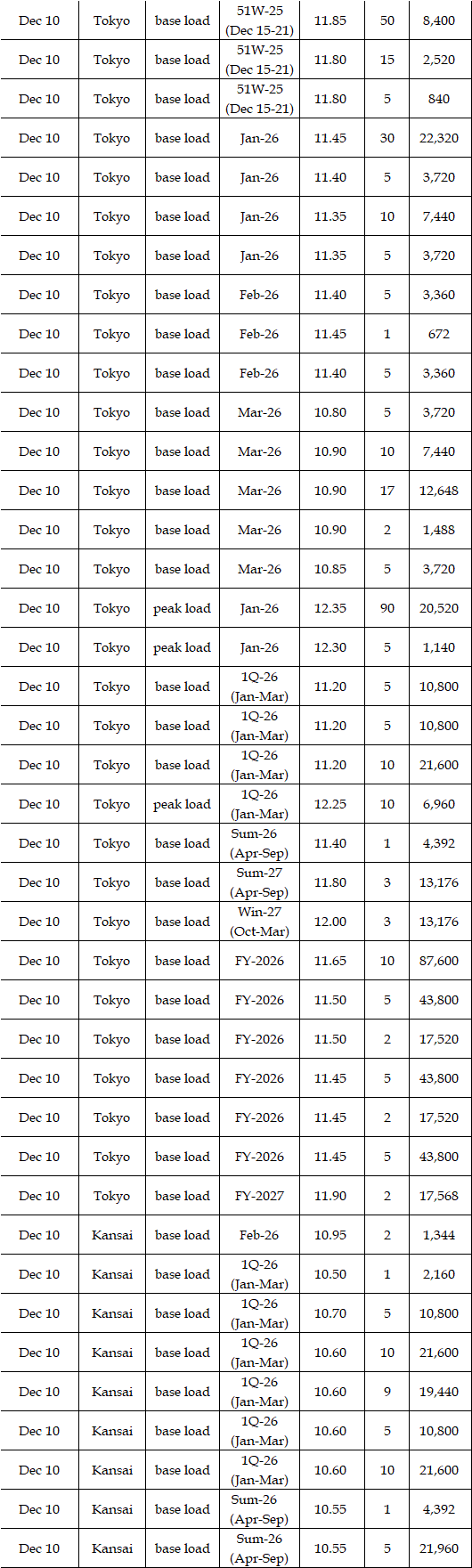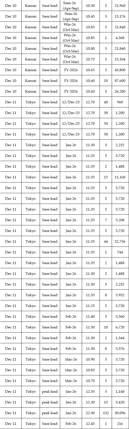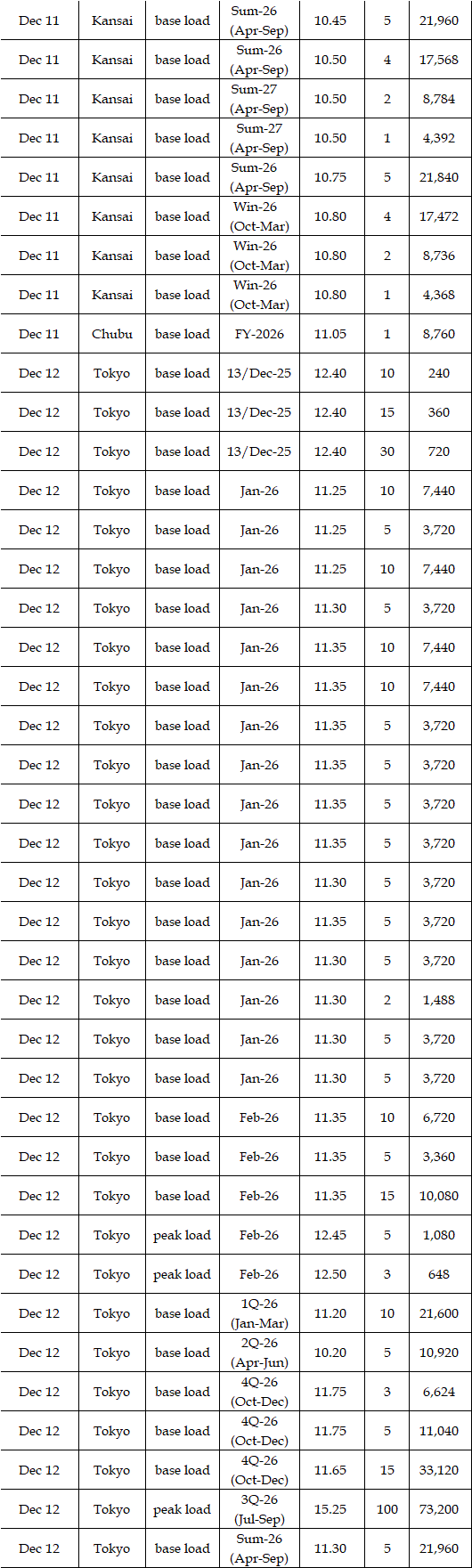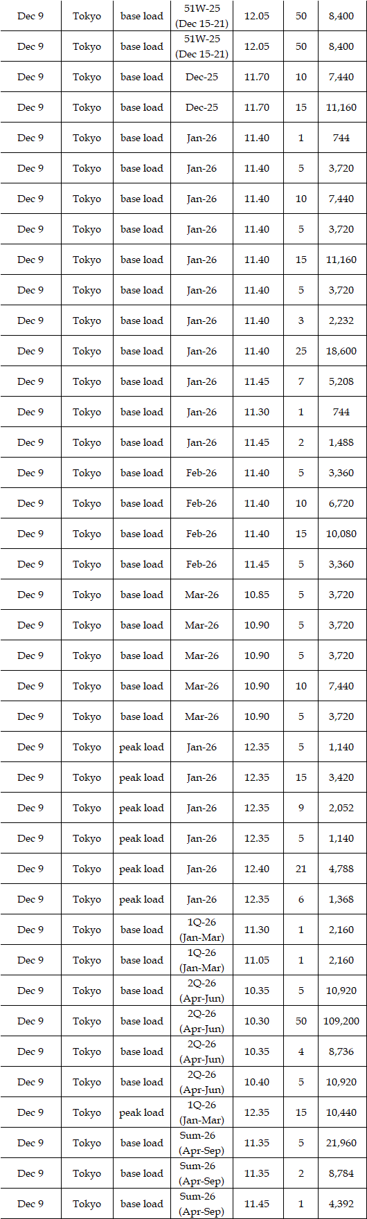 The spread of the 24-hour spot average between Tokyo and Kansai, a major market area in East and West Japan, was Yen 0.78 on Dec 8, Yen 0.16 on Dec 10, Yen 0.62 on Dec 11, & Yen 0.22 on Dec 12 in favor of the East; and Yen 0.30 on Dec 9 in favor of the West.