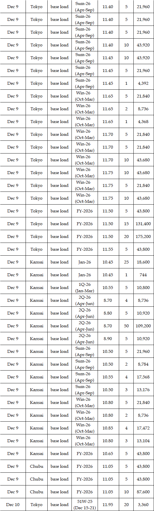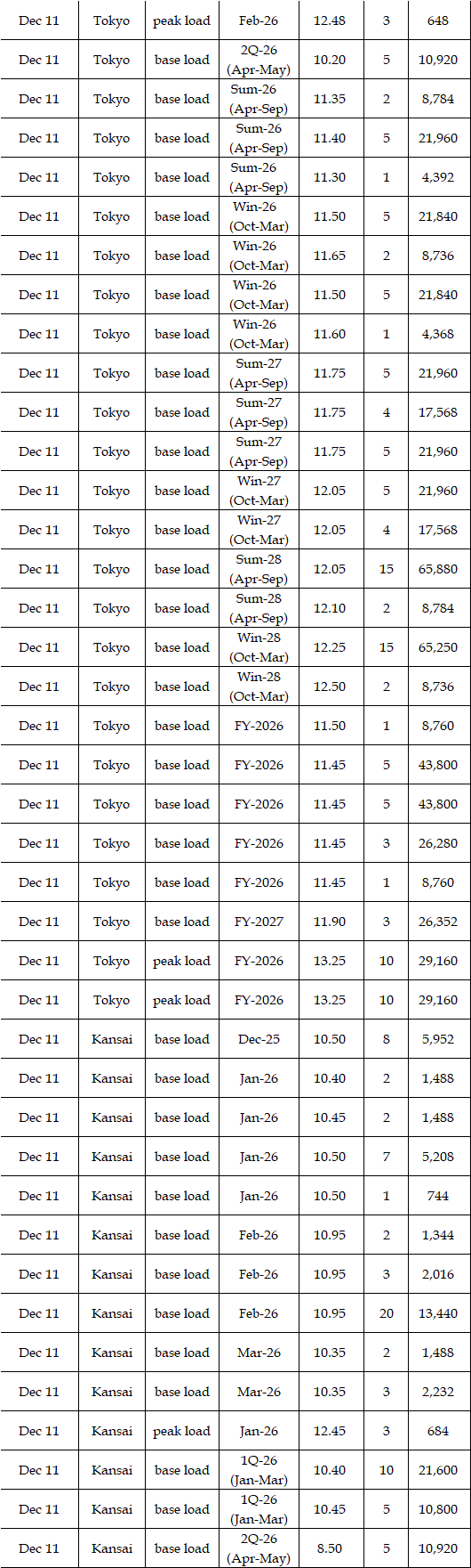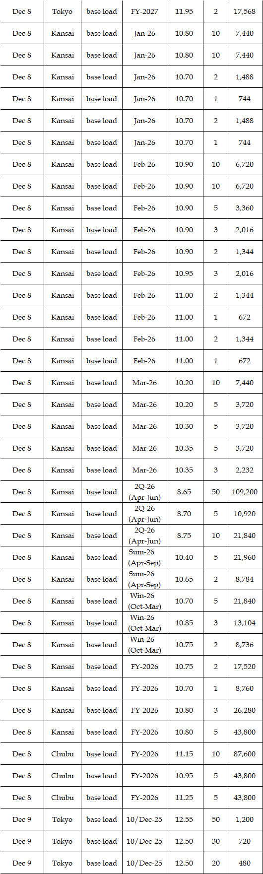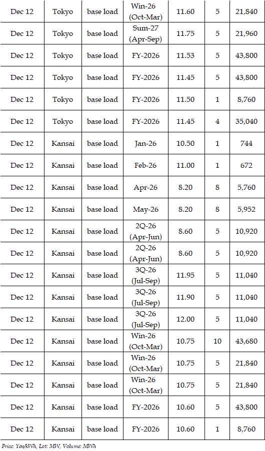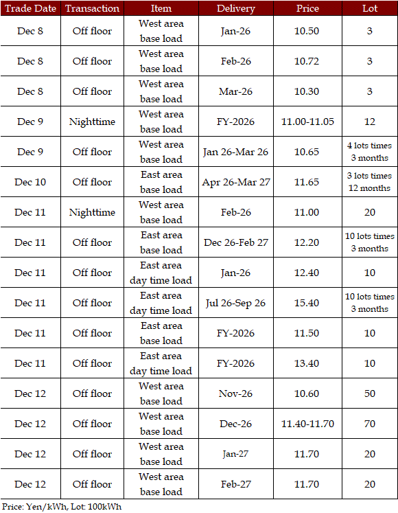 The spread of the 24-hour spot average between Tokyo and Kansai, a major market area in East and West Japan, was Yen 0.78 on Dec 8, Yen 0.16 on Dec 10, Yen 0.62 on Dec 11, & Yen 0.22 on Dec 12 in favor of the East; and Yen 0.30 on Dec 9 in favor of the West.