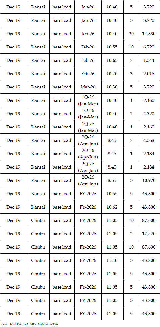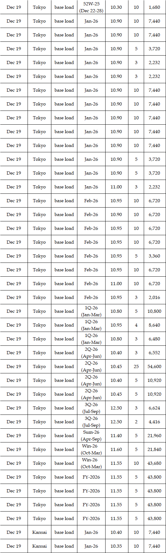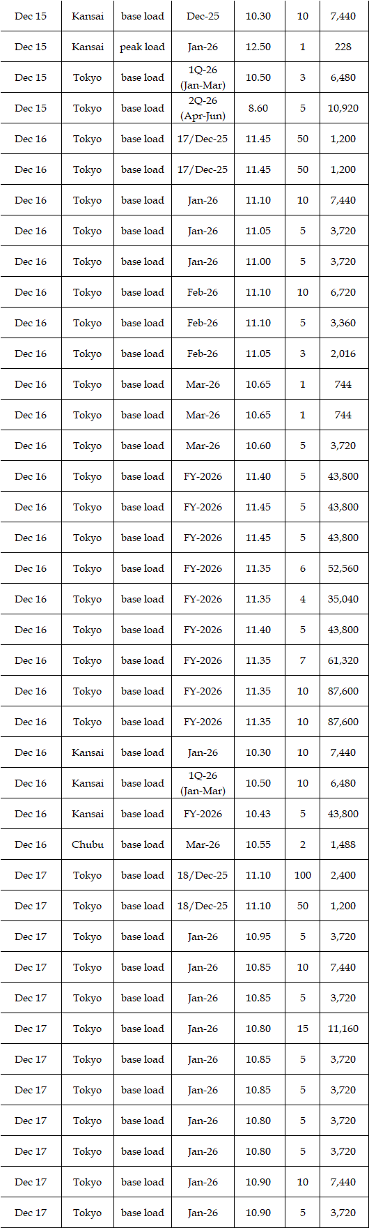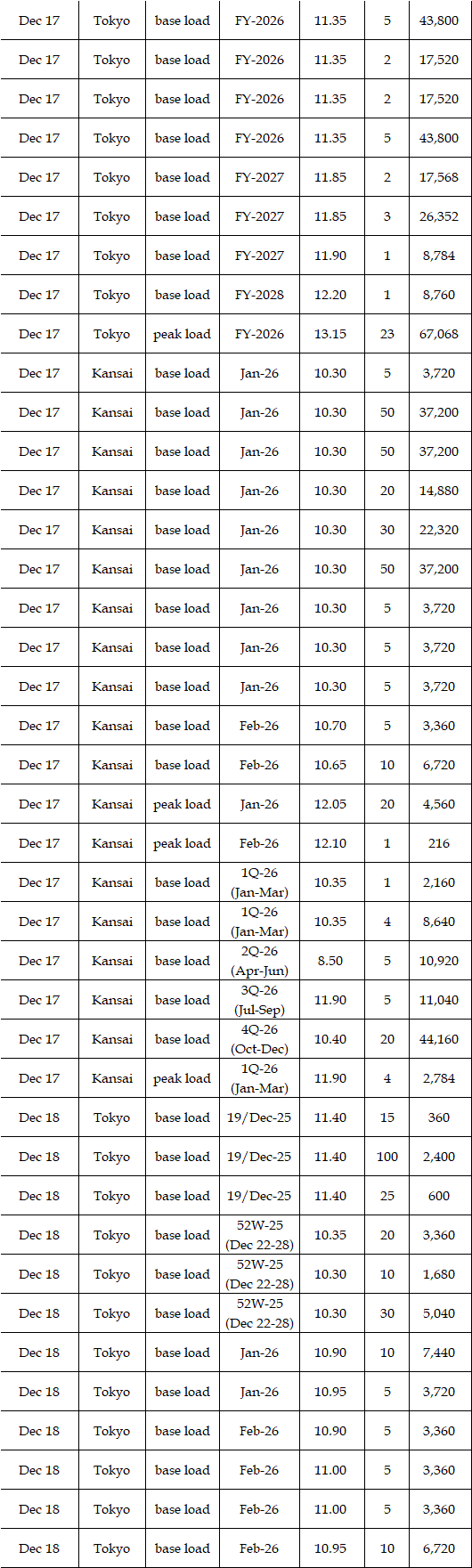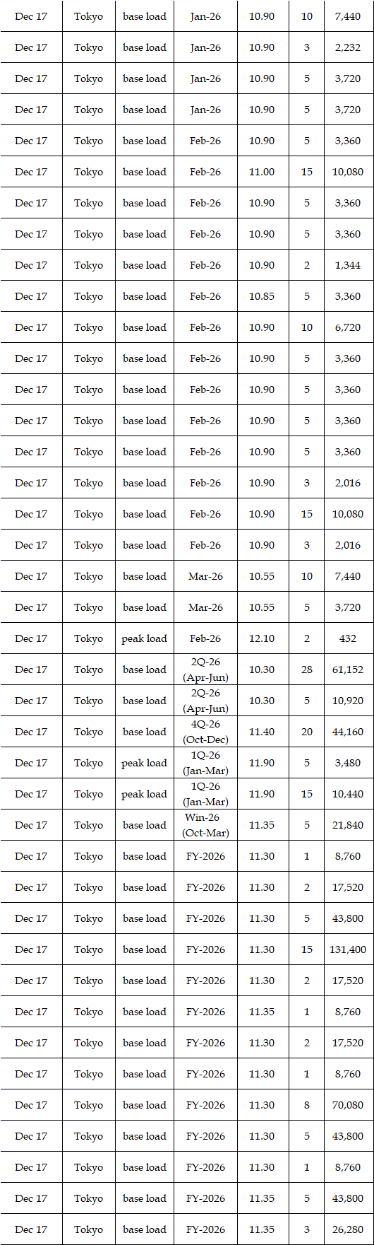 Prices for the fourth week in December would be likely to hover at the same level as those in the third week of the month. Temperatures were expected to be above the usual, limiting demand for heating. A possible weather collapse was to come in the middle of the week; however, that was sandwiched by a sunny spell in the first half and second half of the week, which might work to weigh on prices through ample outputs from photovoltaic power plants. Moreover, with the arrival of the Christmas holiday, the market would be subdued mainly among traders overseas, and so was the softened fuel market. Asked about the outlook for the fourth week, a source at a power producer and supplier said, "Prices will hover at the range from the mid-Yen 10.00's to around $11.00 for Tokyo and at Yen 9.00's for Kansai. Prices will be low within this year."