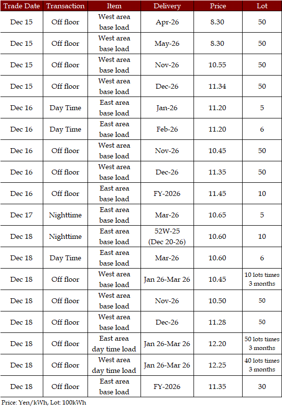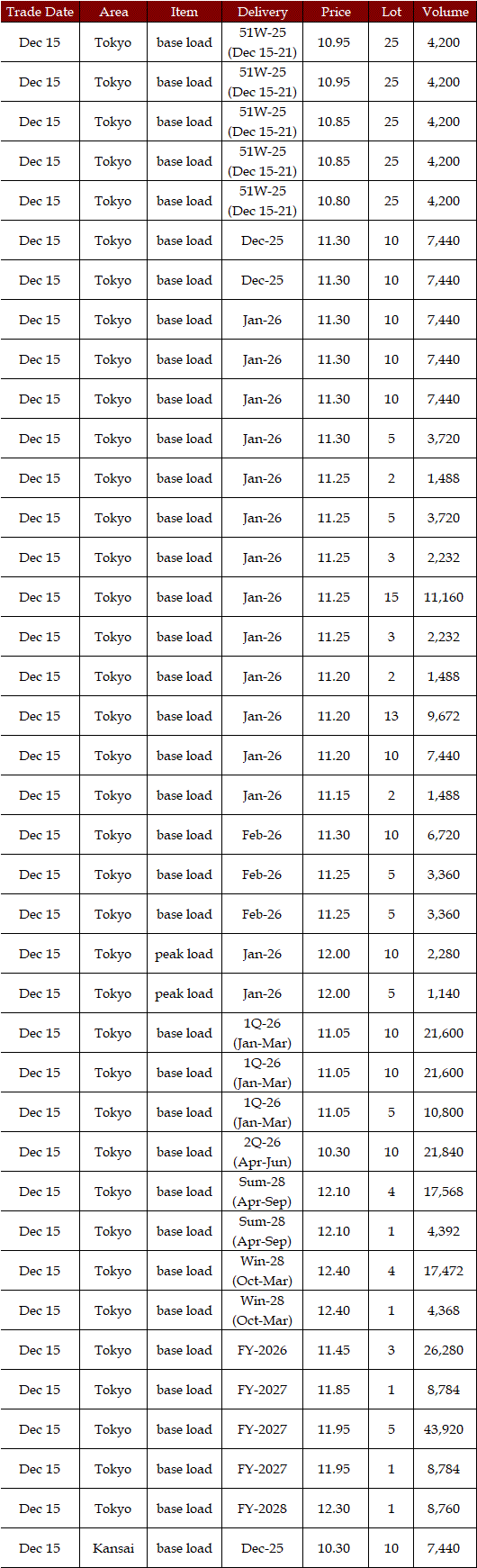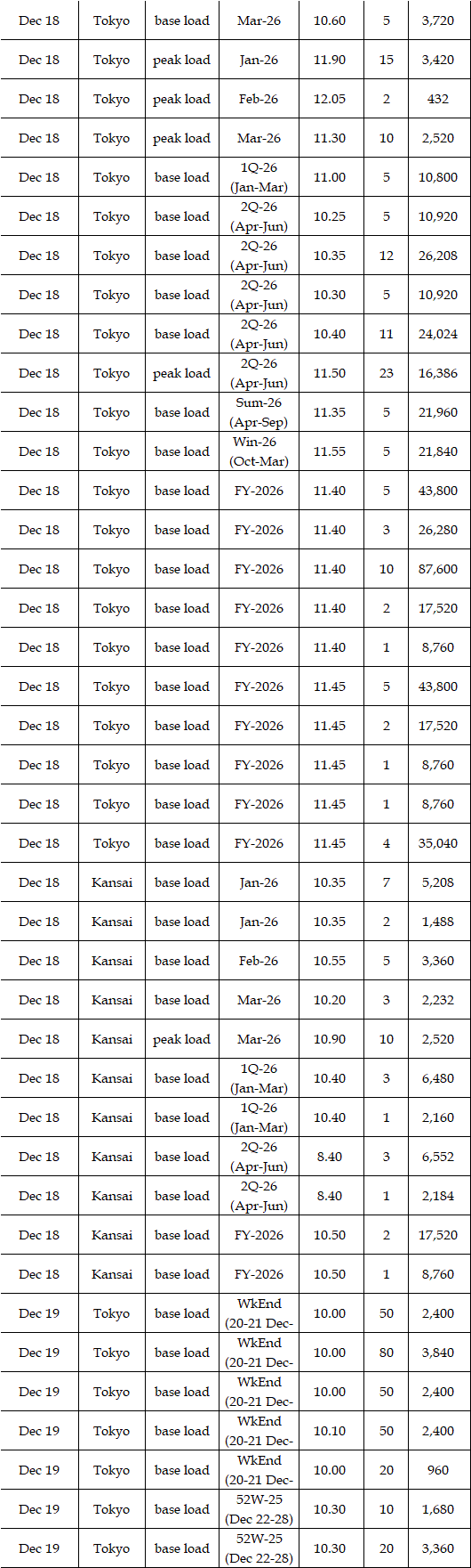 The spread of the 24-hour spot average between Tokyo and Kansai, a major market area in East and West Japan, was Yen 0.63 on Dec 15, Yen 2.36 on Dec 16, Yen 1.00 on Dec 11, Yen 1.97 on Dec 18, and Yen 2.07 on Dec 19 in favor of the East.