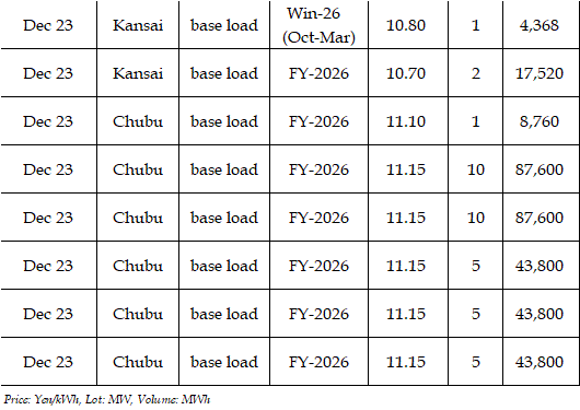In the day-ahead market on JEPX (Japan Electric Power Exchange), the 24-hour spot power prices on a weekly average basis for Dec 22-26 delivery fell further in East Japan (50 Hz) and in West Japan (60 Hz) from the week before. Despite normal weather in many areas, a supply/demand balance relaxed due to more thermal power plants returning from their maintenances and limited market participants from overseas during the holiday season, lowering prices. In Hokkaido, however, the price rose, unlike other areas, on many days to Yen 30 owing to a tight supply/demand balance derived from colder temperatures and the outage of one of the Hokkaido-Honshu lines.