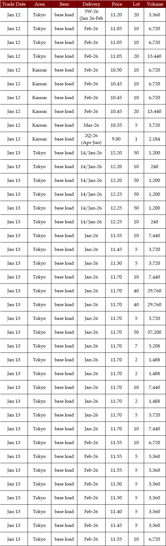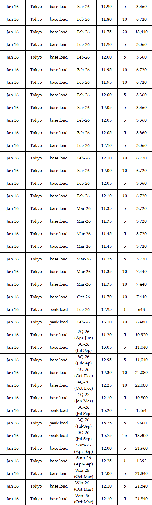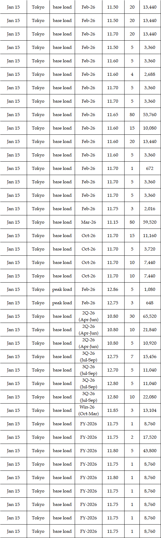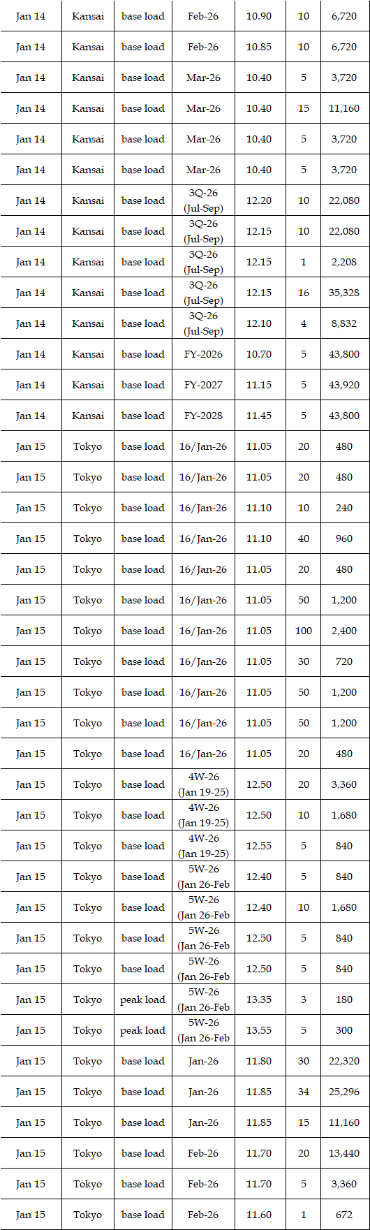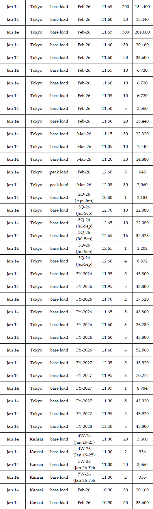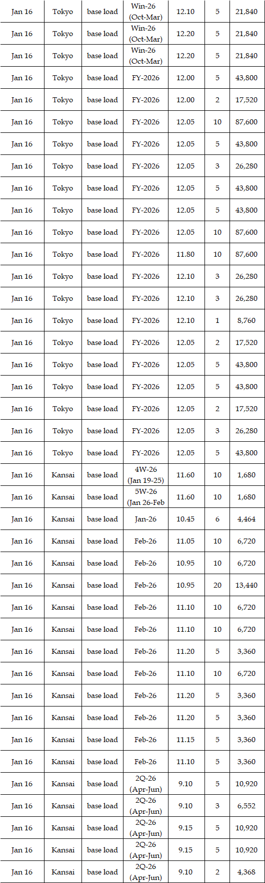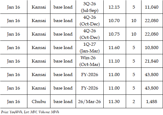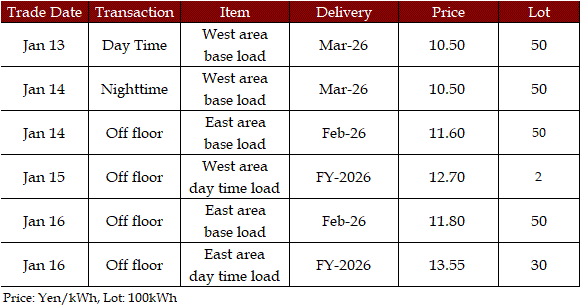 The actual highest price during the week was at Yen 22.35 in Chubu on Jan 14; the actual lowest price during the week was at Yen 0.01 in Shikoku on Jan 13-14 as well as in five areas (Hokuriku, Kansai, Chugoku, Shikoku, and Kyushu) on Jan 16.