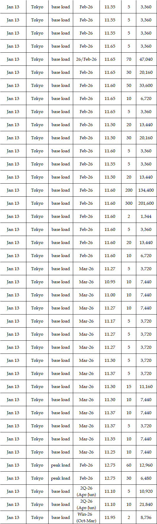 Prices for the fourth week in January might be boosted from the third of week. Lower temperatures than the previous week were expected, which would increase demand for heating and then lift prices. The maintenance at the 825MW No. 2 unit (BWR: Boiling Water Reactor) at Tohoku Electric Power Co's Onagawa nuclear power station, located in Onagawa Town in Miyagi Prefecture, from Jan 14 would also work as a bullish factor. One thing difficult to estimate is the impact of the reactivation of the 1356 MW No. 6 unit (ABWR = Advanced Boiling Water Reactor) at Tokyo Electric Power Co's Kashiwazaki-Kariwa nuclear power station, located in Kashiwazaki City in Niigata Prefecture, on Jan 20. After the reactivation, the unit was scheduled to resume power generation within a couple of days, which might work as a bearish factor. Asked about the outlook for the fourth week of Jan, a source at a power producer and supplier said. "I guess base load will hover at Yen 12-13's in Tokyo and at Yen 10-11's in Kansai. Lower temperatures will lift prices up; however, following before, prices will not soar unless there are troubles with power plants."