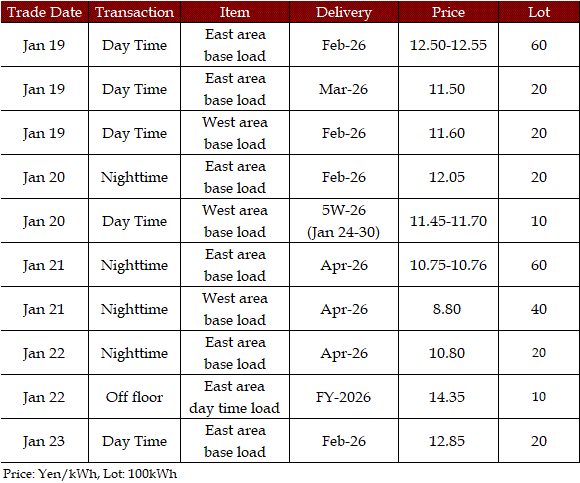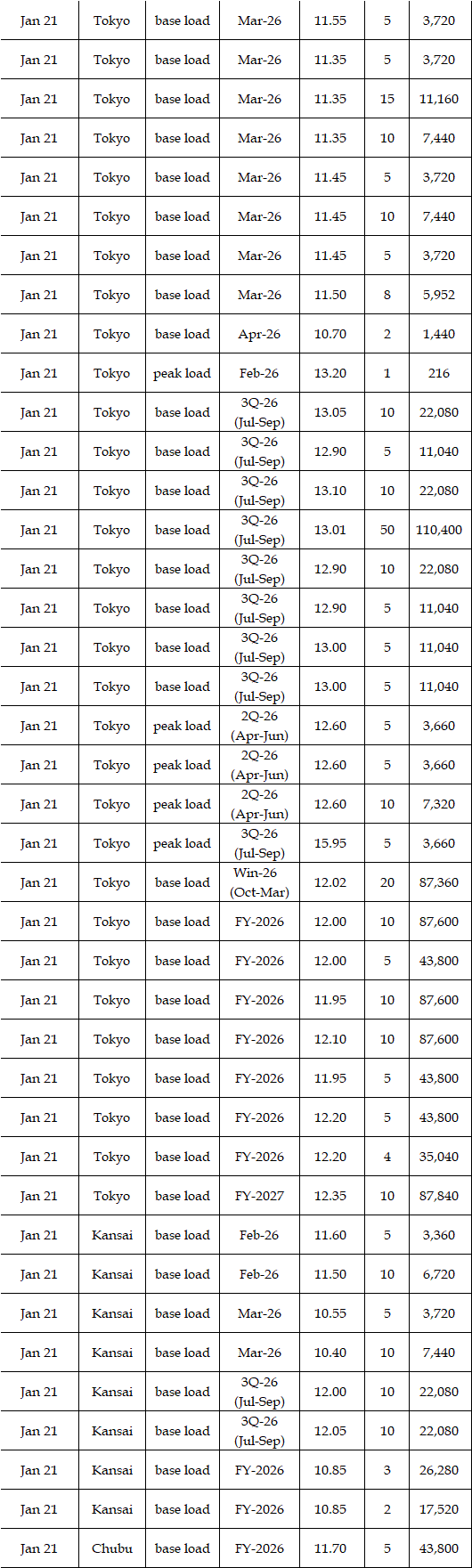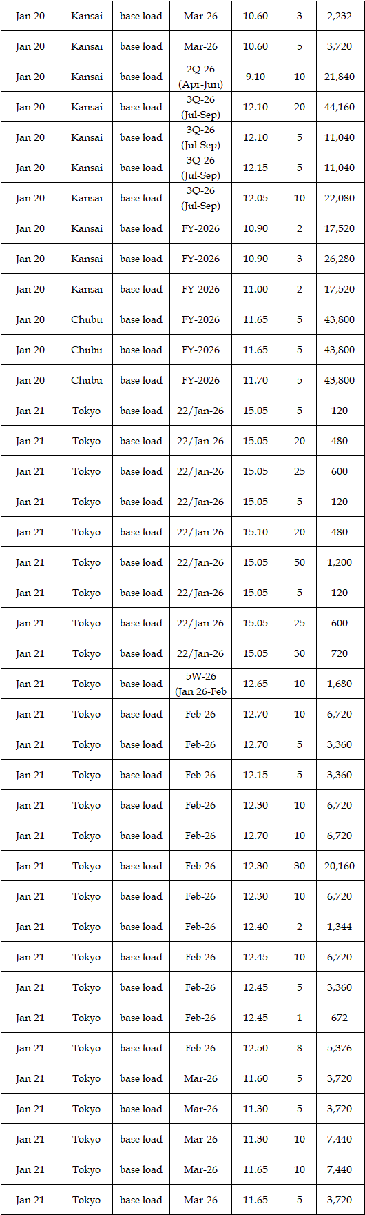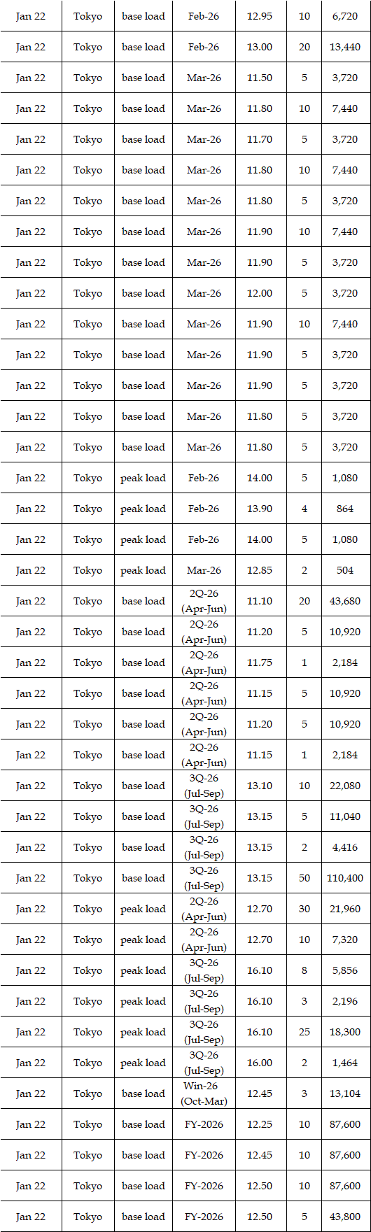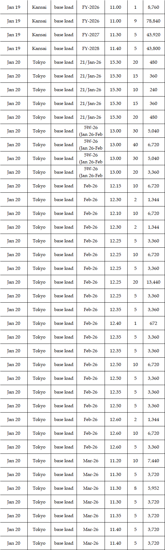 In the day-ahead market on JEPX (Japan Electric Power Exchange), the 24-hour spot power prices on a weekly average basis for Jan 19-23 delivery rebounded in East Japan (50 Hz) and in West Japan (60 Hz) from the week before. The mean prices during the week were over Yen 2.00 higher than the previous week in every area except the Tokyo and Chubu areas. The weather forecast released urgently by the Japan Meteorological Agency (JMA) on Jan 19 indicated that heavy snow would last for a long time in the areas mainly on the Japan Sea coast side from North to West Japan owing to a spell of the strong winter pressure patterns in the vicinity of Japan from around Jan 21 to 25. As a result, demand for power grew by 6% from a week earlier, with more than 10% growth in many areas. Indeed, in the JEPX auction for Jan 21-22 delivery, the volume of bids surpassed that of offers for the first time since Nov 13, 2025. Despite such a tight supply/demand balance in power, however, prices did not soar. In the market, " stable supply plays a crucial role in the stable prices. Thus, unless an inclement cold spell comes, a price spike will not occur in the market, as forecasted before," a source at a power producer and supplier said.