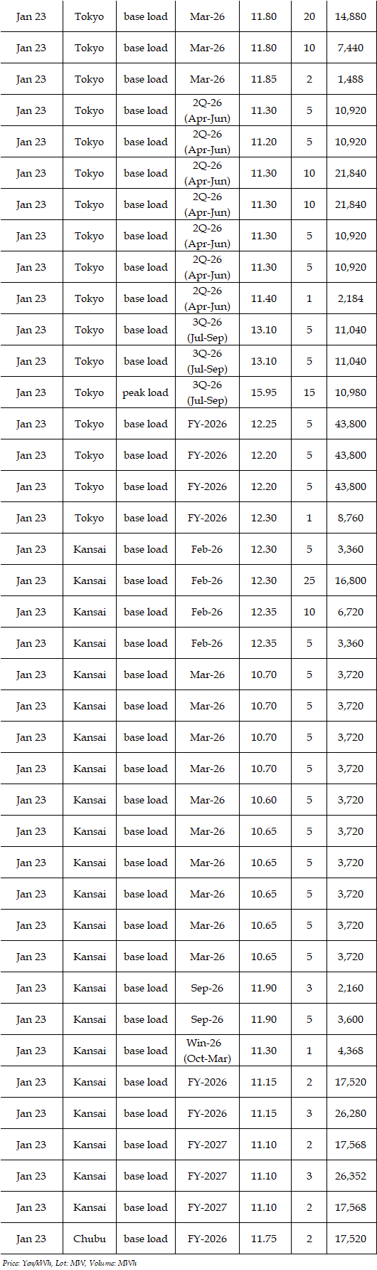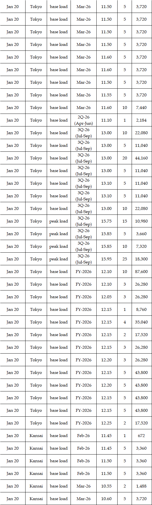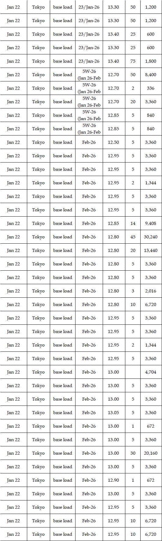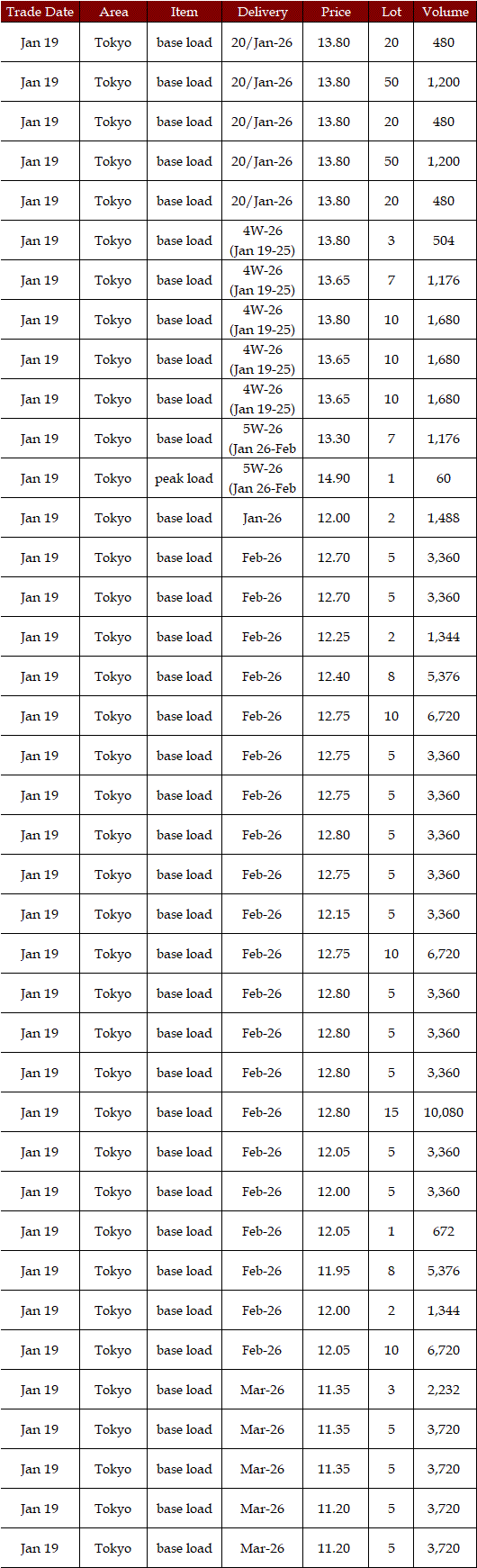 In the day-ahead market on JEPX (Japan Electric Power Exchange), the 24-hour spot power prices on a weekly average basis for Jan 19-23 delivery rebounded in East Japan (50 Hz) and in West Japan (60 Hz) from the week before. The mean prices during the week were over Yen 2.00 higher than the previous week in every area except the Tokyo and Chubu areas. The weather forecast released urgently by the Japan Meteorological Agency (JMA) on Jan 19 indicated that heavy snow would last for a long time in the areas mainly on the Japan Sea coast side from North to West Japan owing to a spell of the strong winter pressure patterns in the vicinity of Japan from around Jan 21 to 25. As a result, demand for power grew by 6% from a week earlier, with more than 10% growth in many areas. Indeed, in the JEPX auction for Jan 21-22 delivery, the volume of bids surpassed that of offers for the first time since Nov 13, 2025. Despite such a tight supply/demand balance in power, however, prices did not soar. In the market, " stable supply plays a crucial role in the stable prices. Thus, unless an inclement cold spell comes, a price spike will not occur in the market, as forecasted before," a source at a power producer and supplier said.