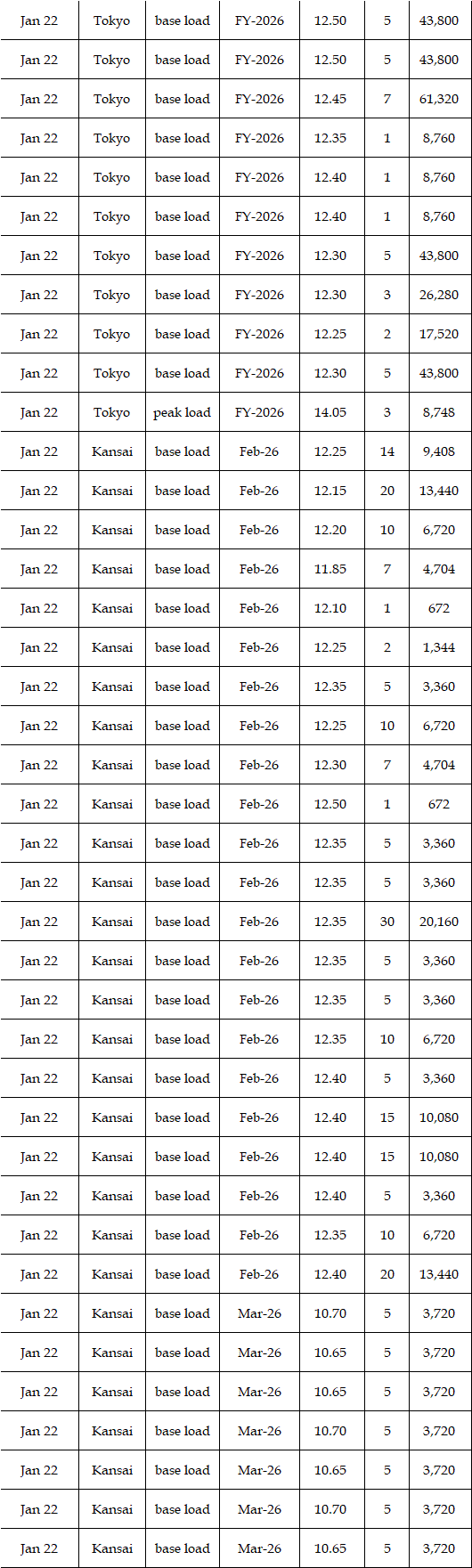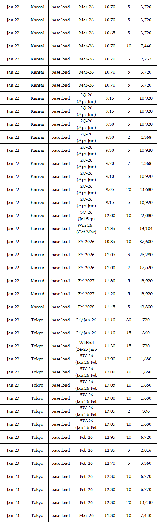 The spread of the 24-hour spot average between Tokyo and Kansai, a major market area in East and West Japan, was Yen 3.37 on Jan 19, Yen 1.39 on Jan 20, Yen 2.08 on Jan 21, & Yen 0.20 on Jan 22 in favor of the East, and Yen 0.41 in favor of the West on Jan 23.