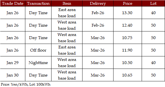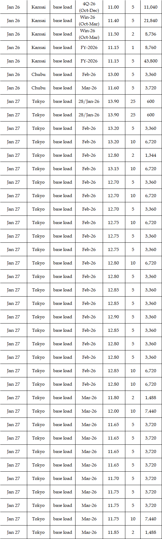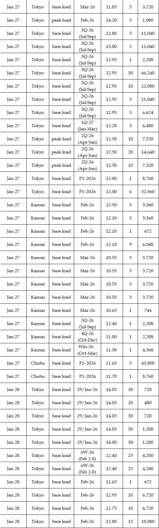 Deals reported on EEX (European Energy Exchange) during Jan 26-30 were as below.