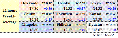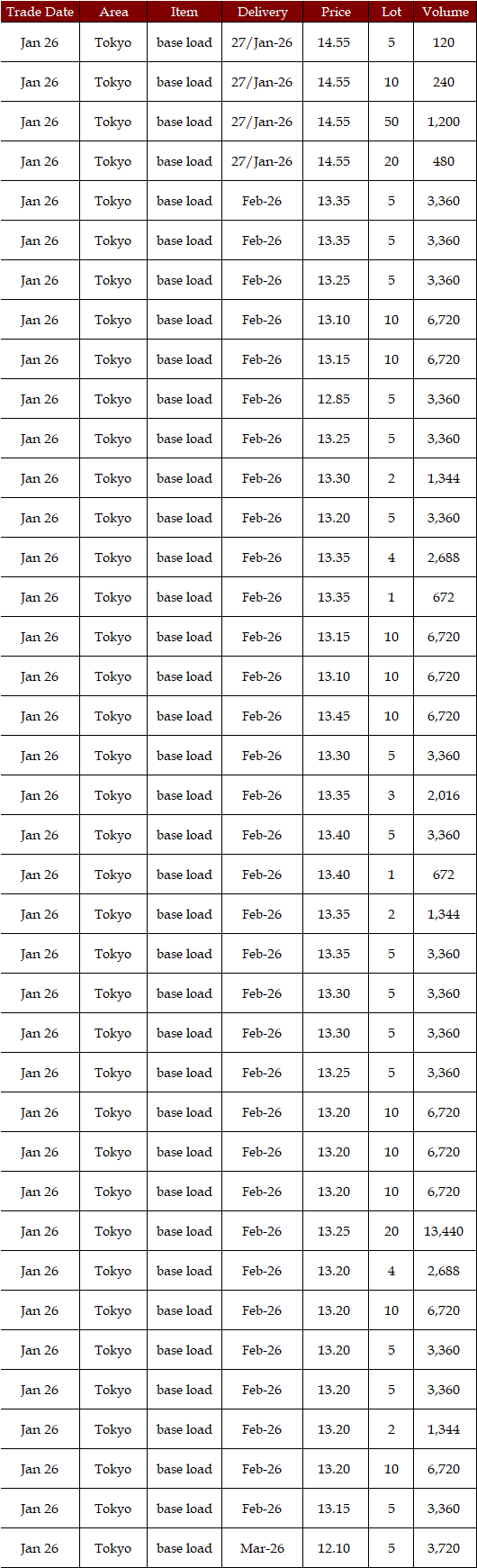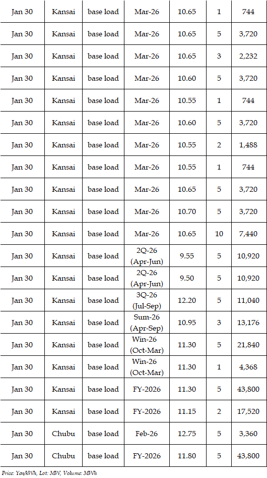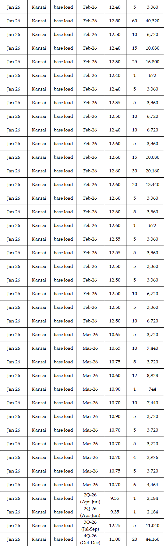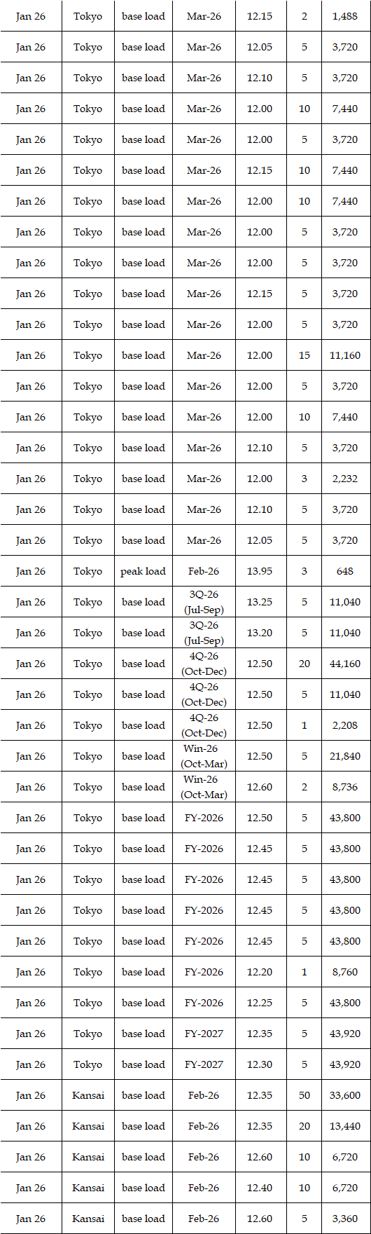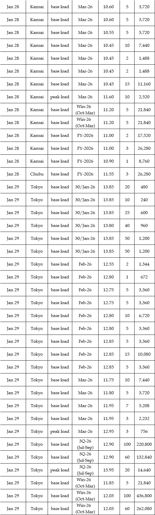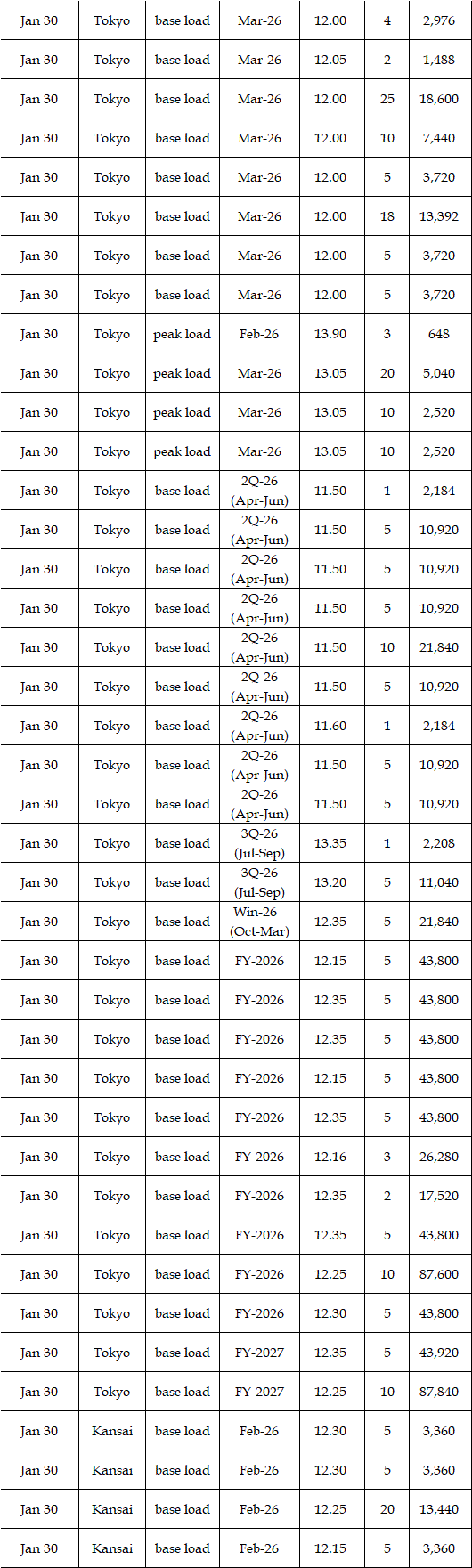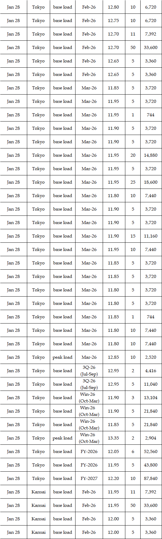 The actual highest price during the week was at Yen 45.01 in four areas from Hokkaido through Chubu on Jan 26; the actual lowest price during the week was at Yen 6.46 in Shikoku on Jan 26.