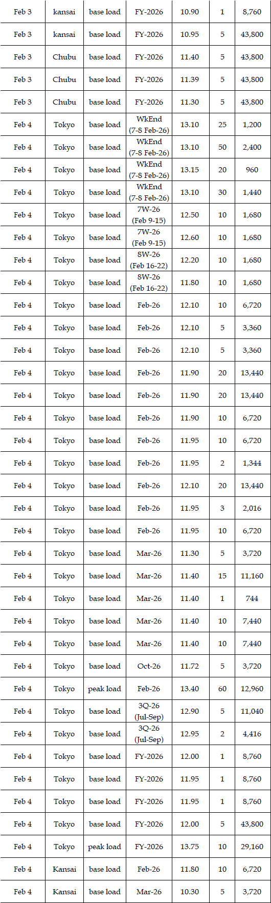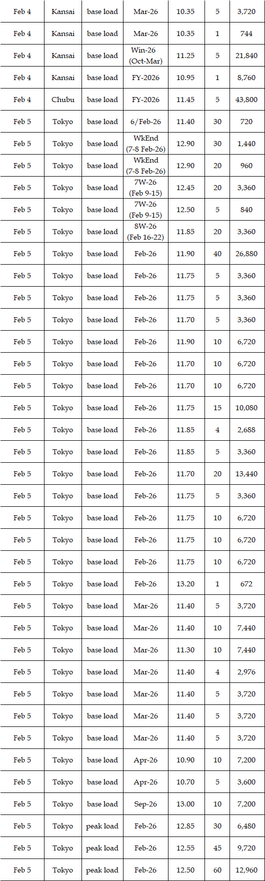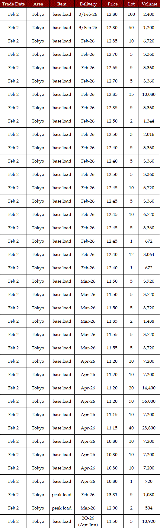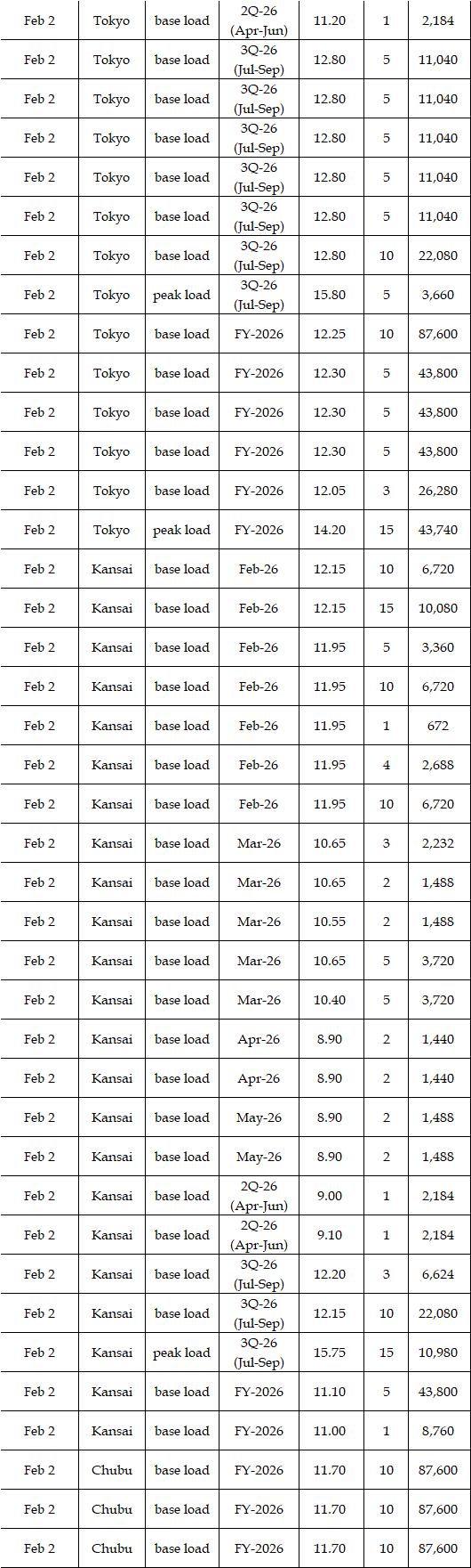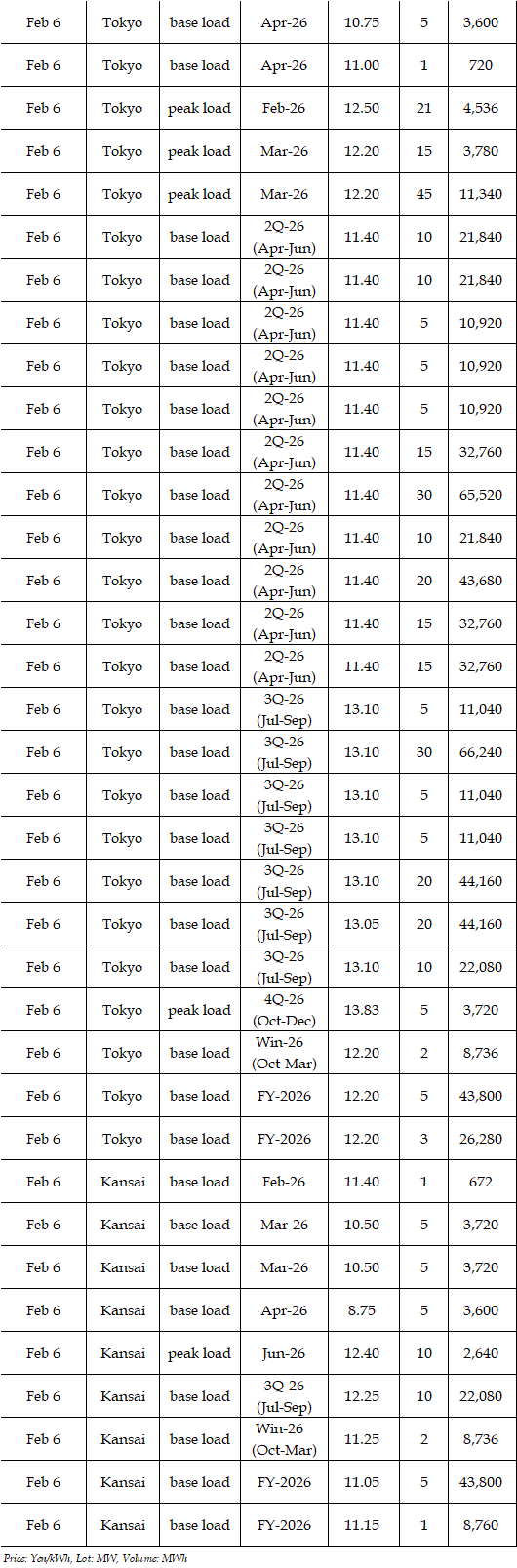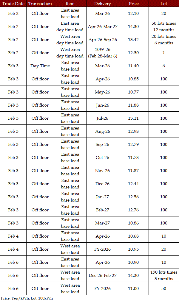The spread of the 24-hour spot average between Tokyo and Kansai, a major market area in East and West Japan, was Yen 0.33 on Feb 2, Yen 0.73 on Feb 5, and Yen 0.48 on Feb 6 in favor of the East; and Yen 0.42 on Feb 3 and Yen 0.48 on Feb 4 in favor of the West.