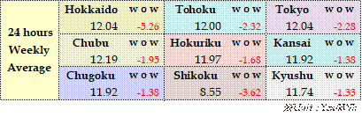The weekly average of the 24-hour spot prices by area, the weekly average volume of offers, bids, and trades are shown in the table below. Prices slumped from the previous week in all nine areas. The volume of offers increased rapidly, but the volume of bids decreased; the transaction volume was almost the same as the previous week.
