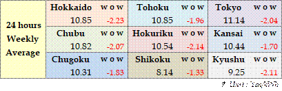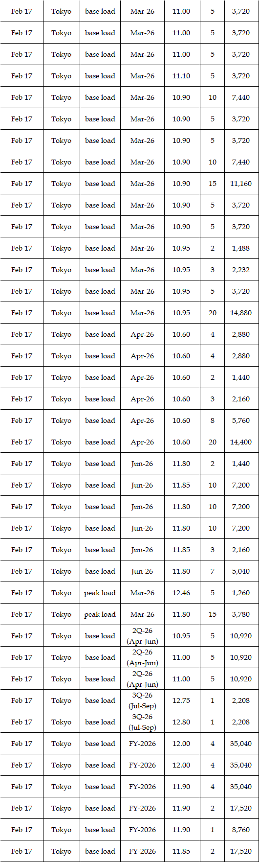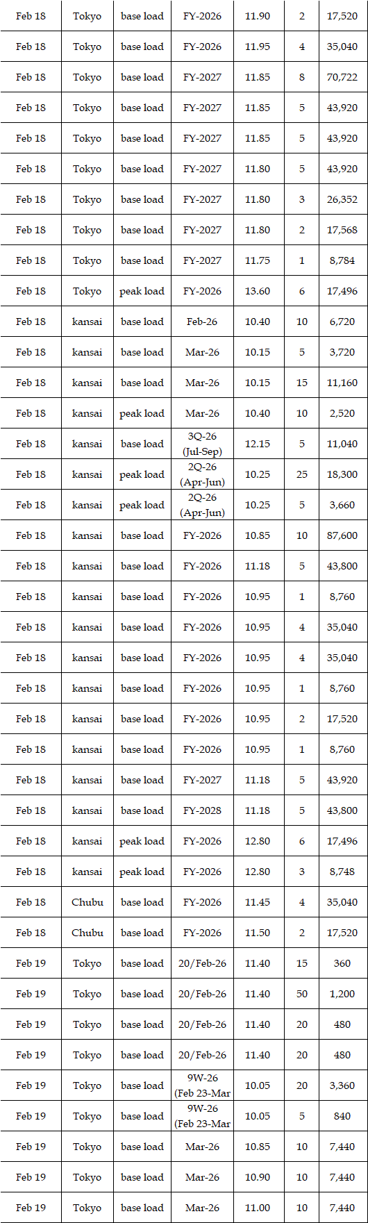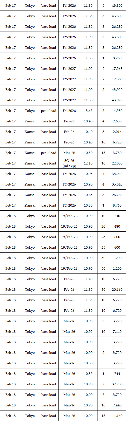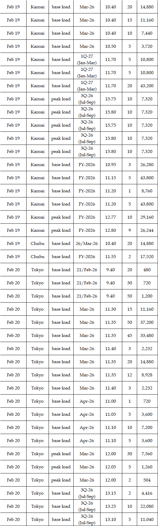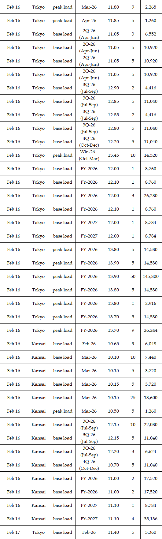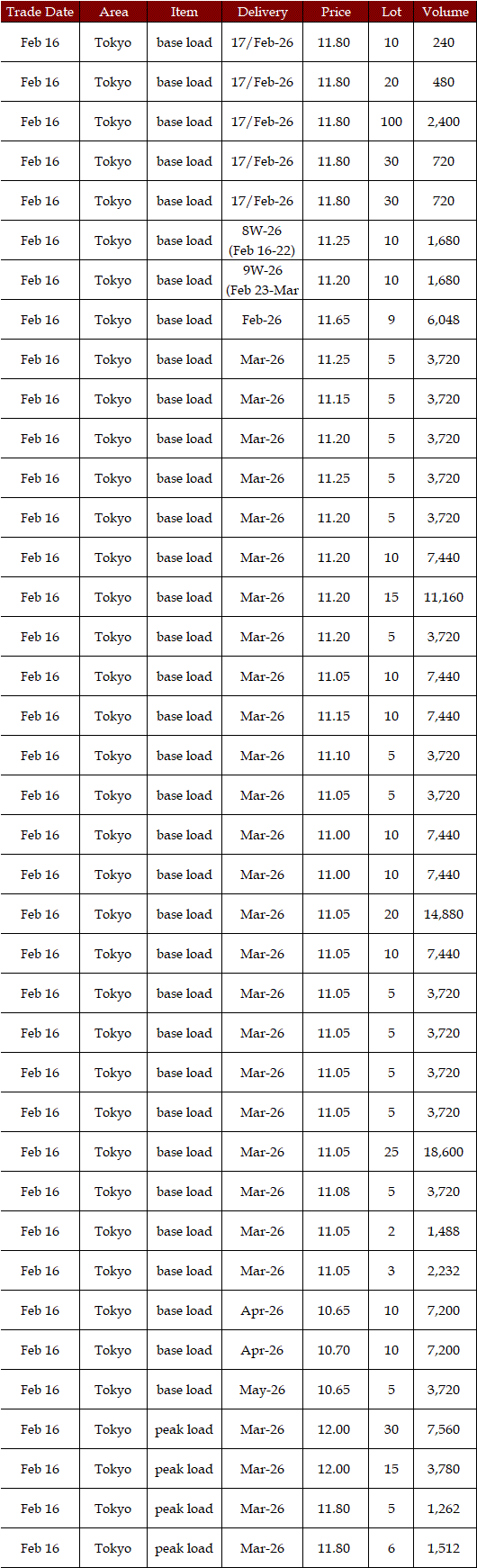 The actual highest price during the week was at Yen 15.30 in four areas from Hokkaido through Chubu on Feb 17; the actual lowest price during the week was at Yen 0.01 in Shikoku on Feb 16 & 18 and in Kyushu on Feb 17-20.