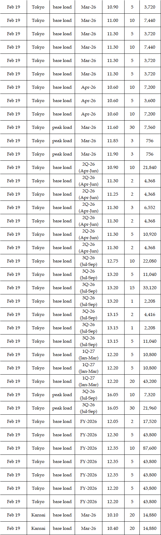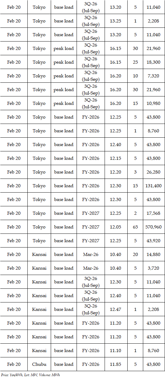 The spread of the 24-hour spot average between Tokyo and Kansai, a major market area in East and West Japan, was Yen 0.78 on Feb 16, Yen 1.31 on Feb 17, Yen 0.64 on Feb 18, Yen 0.19 on Feb 19, and Yen 0.54 in Feb 20 in favor of Tokyo.