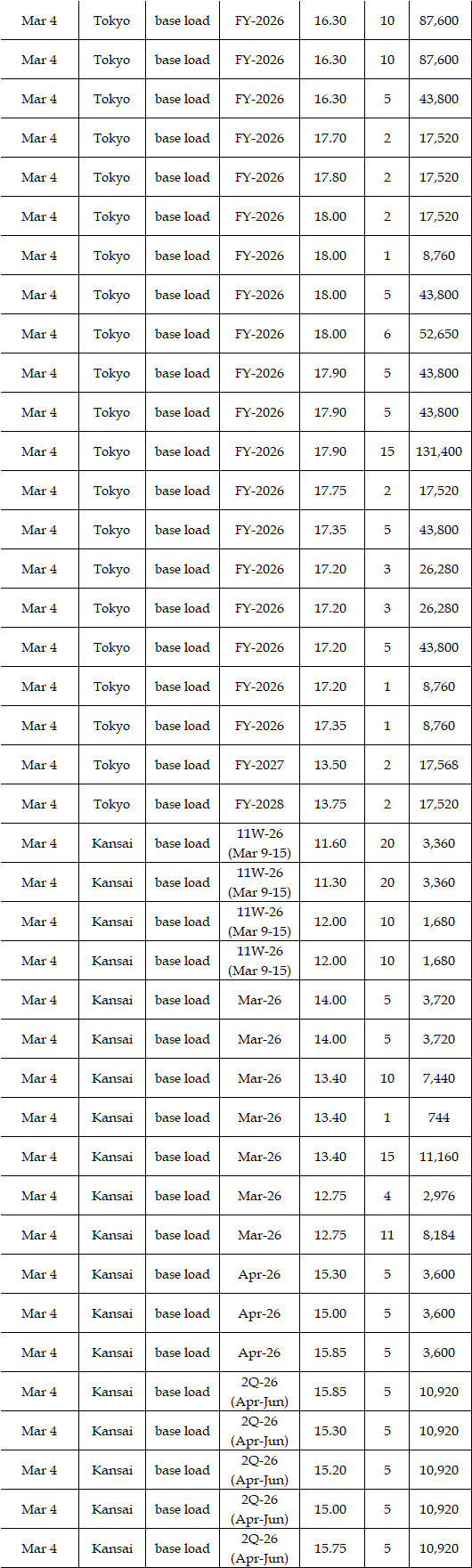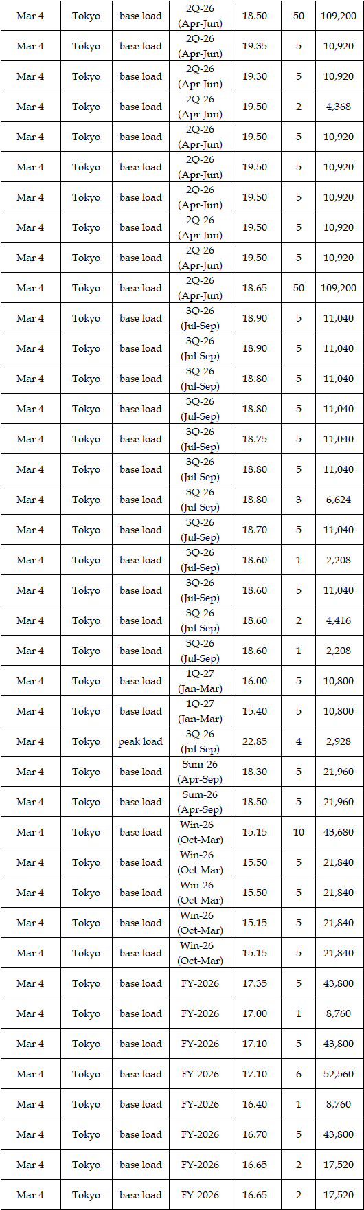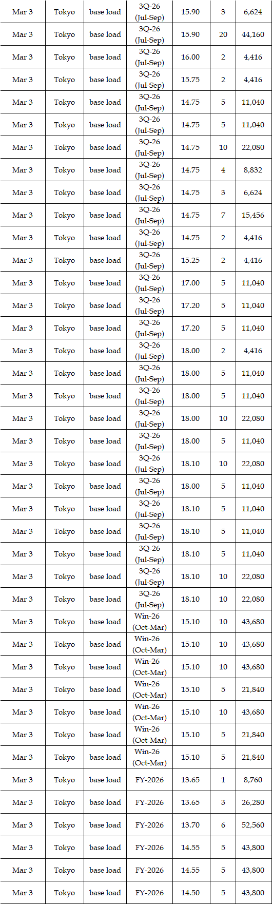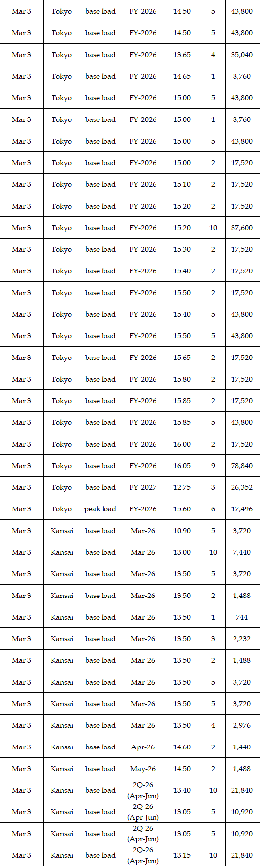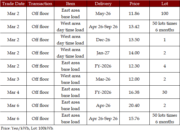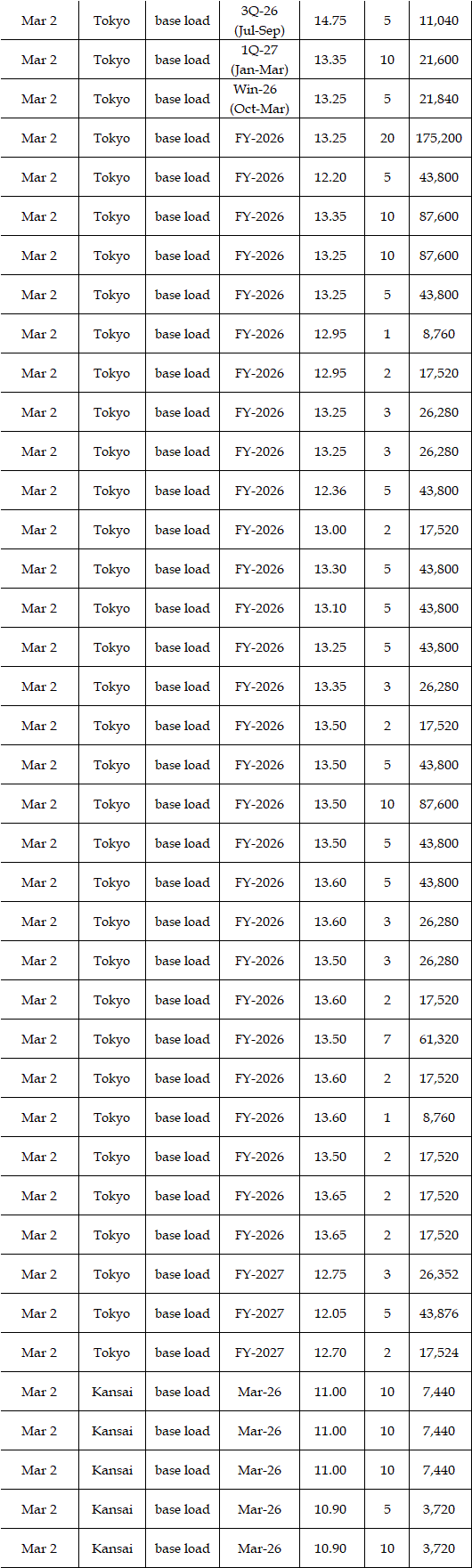 Some viewed that prices for the second week in March were expected to rise from the first week. While temperatures and weather conditions were forecasted to be almost the same, a strong fuel market, along with more thermal power plants entering maintenance, can support the market. Indeed, a source at a power market and producer said, "The fuel market may keep either high at least or higher; the scenario of plunges in the market is quite unlikely, which will have a spillover effect on the power spot prices gradually." Asked about the price outlook for the second week in March, the source said, "The base load will hover at Yen 15's in Tokyo. In Kansai, they will be traded at around Yen 2 lower than those in Tokyo." Many suggested the military conflicts between the US and Iran might linger, which would let them worry about the outlook of power spot prices.