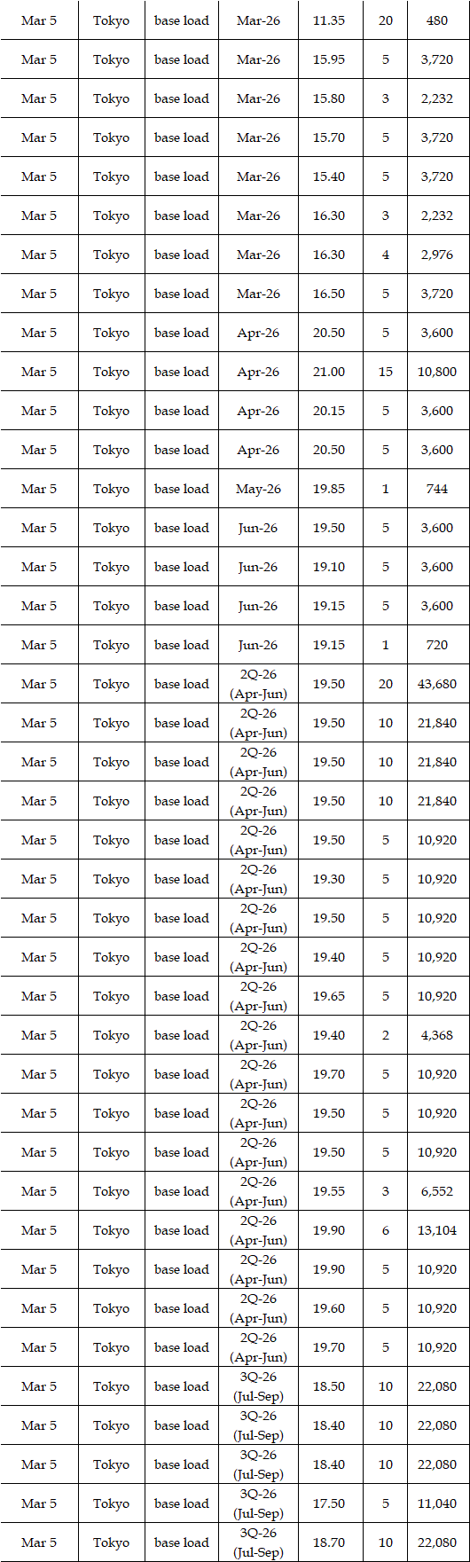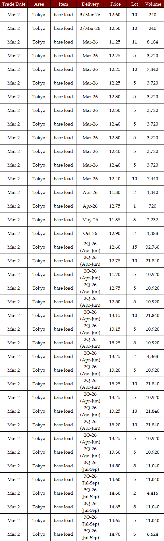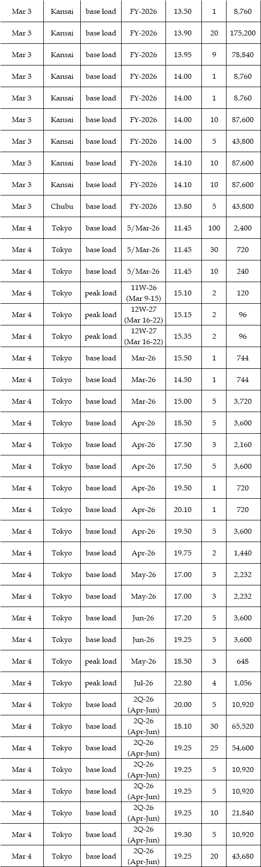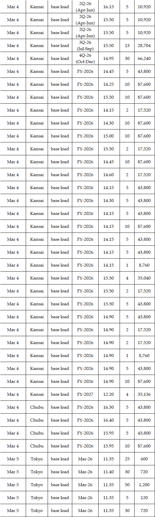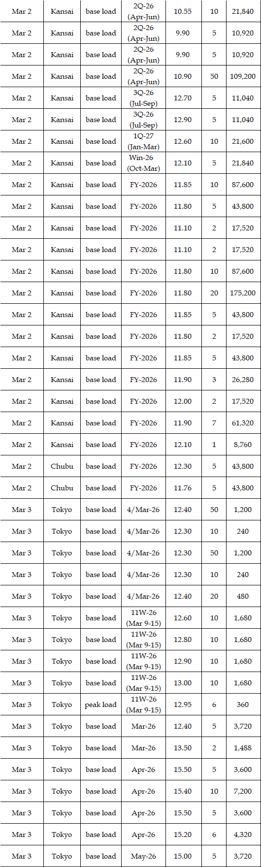 Some viewed that prices for the second week in March were expected to rise from the first week. While temperatures and weather conditions were forecasted to be almost the same, a strong fuel market, along with more thermal power plants entering maintenance, can support the market. Indeed, a source at a power market and producer said, "The fuel market may keep either high at least or higher; the scenario of plunges in the market is quite unlikely, which will have a spillover effect on the power spot prices gradually." Asked about the price outlook for the second week in March, the source said, "The base load will hover at Yen 15's in Tokyo. In Kansai, they will be traded at around Yen 2 lower than those in Tokyo." Many suggested the military conflicts between the US and Iran might linger, which would let them worry about the outlook of power spot prices.