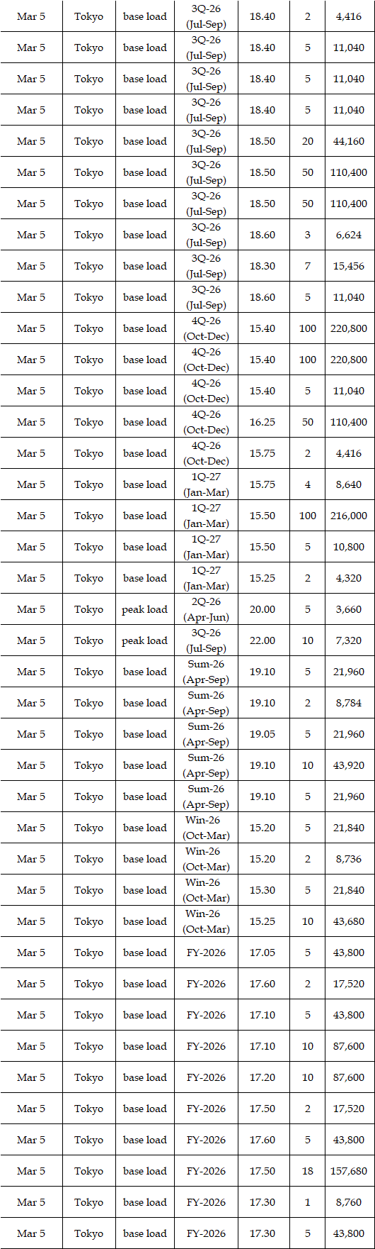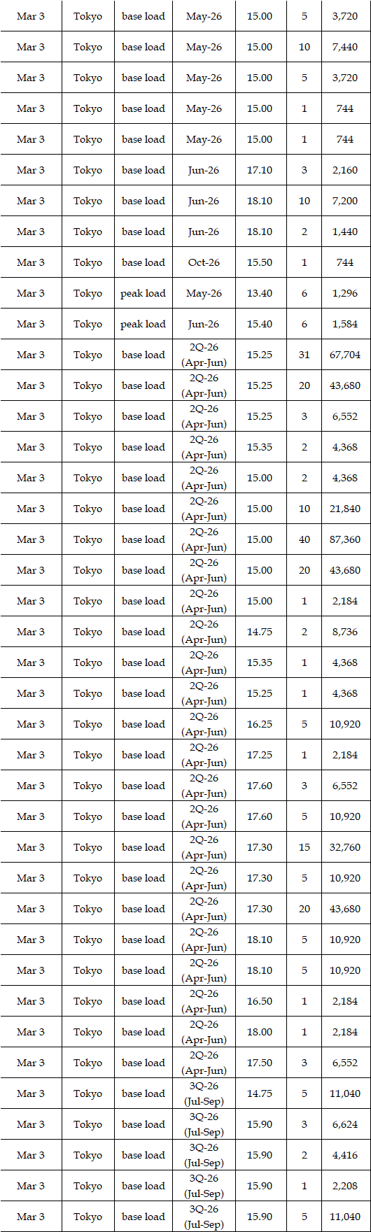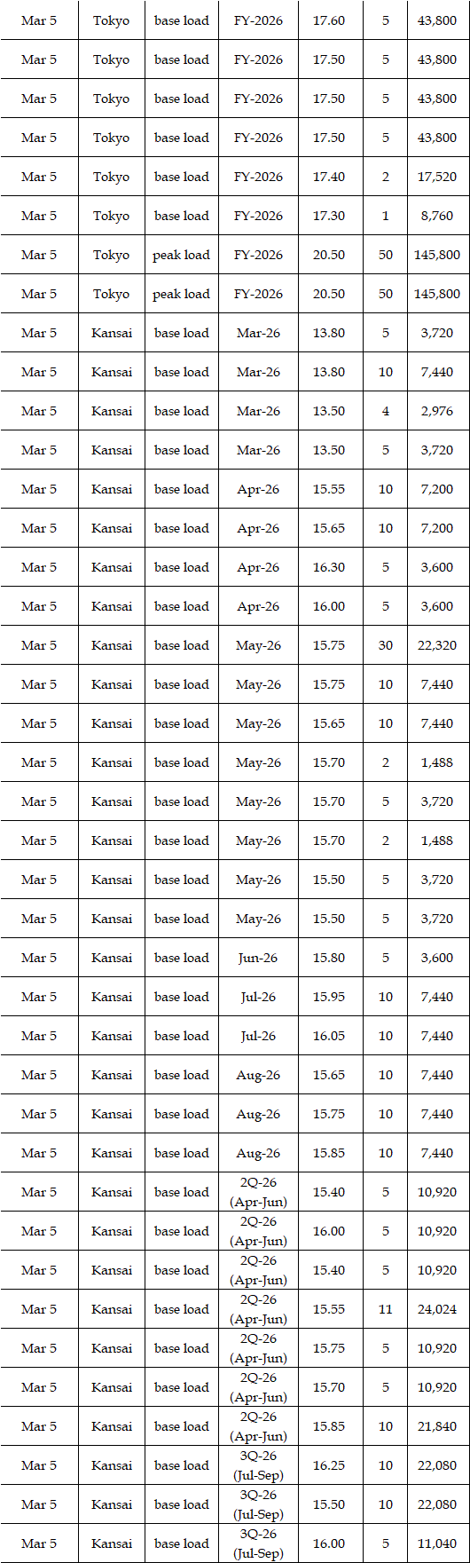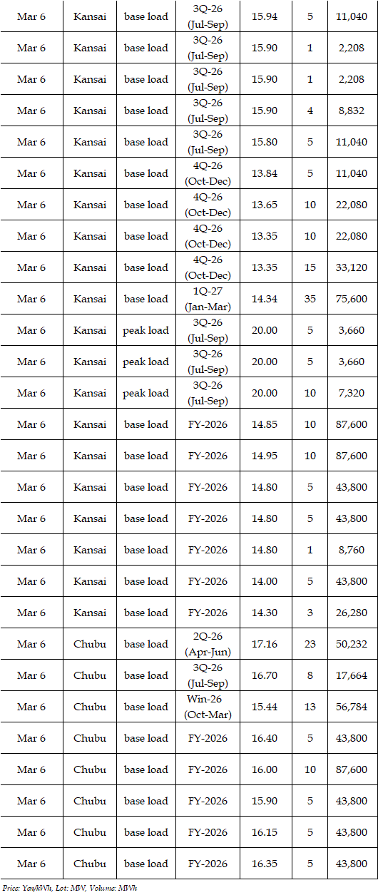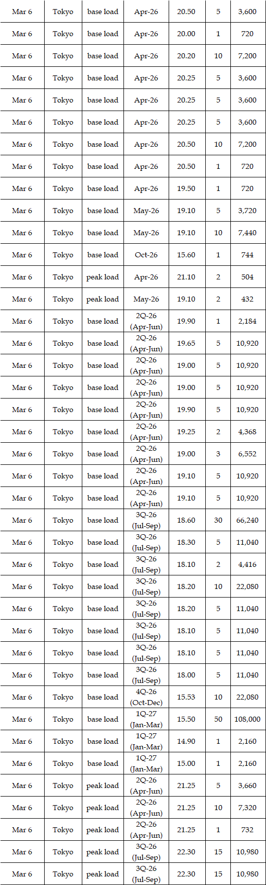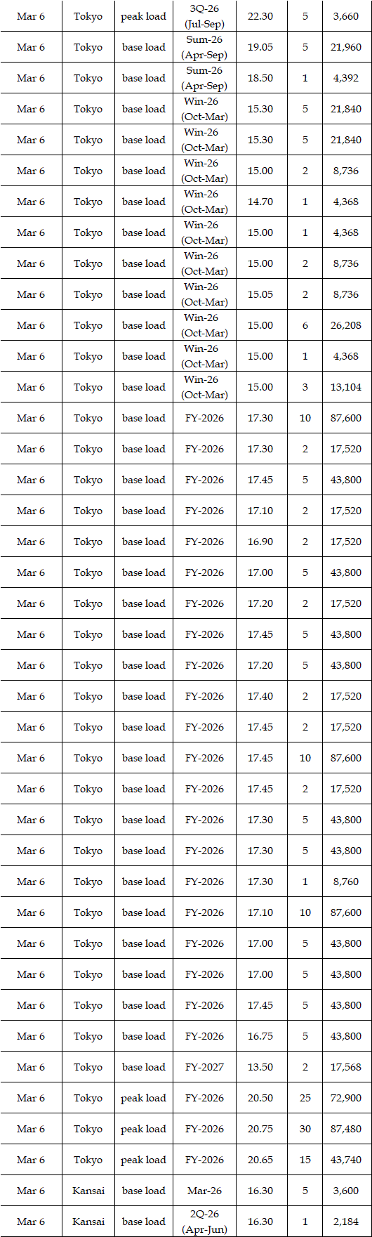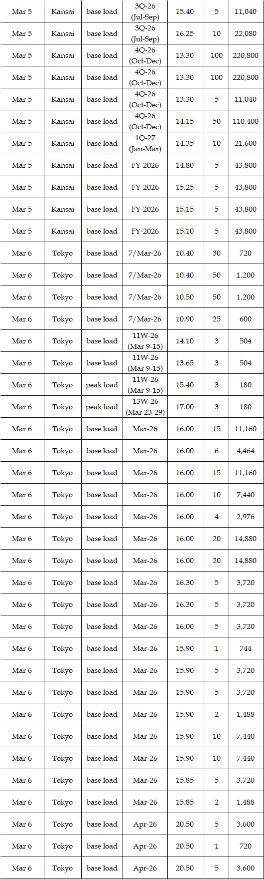The spread of the 24-hour spot average between Tokyo and Kansai, a major market area in East and West Japan, was Yen 2.61 on Mar 2, Yen 3.07 on Mar 3, Yen 1.92 on Mar 4, Yen 1.31 on Mar 5, and Yen 1.28 in Mar 6 in favor of Tokyo.