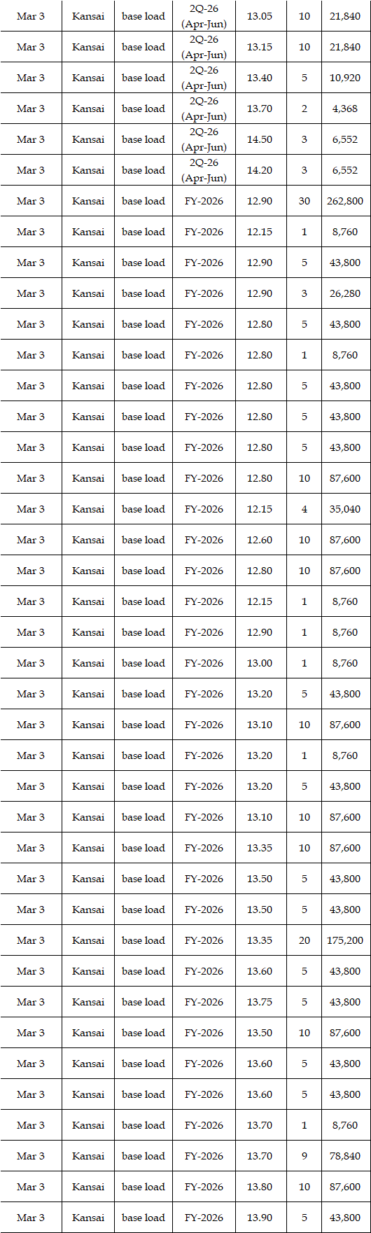Power demand in nine areas of Japan during Mar 2-6 was 12,305.13 mil kWh, up 5.9% from 11,624.67 mil kWh during Feb 23-27. The figure was down 8.6% from the corresponding period a year earlier, which was 13,461.63 mil kWh during Mar 2-7, 2025, after day-of-week adjustment.