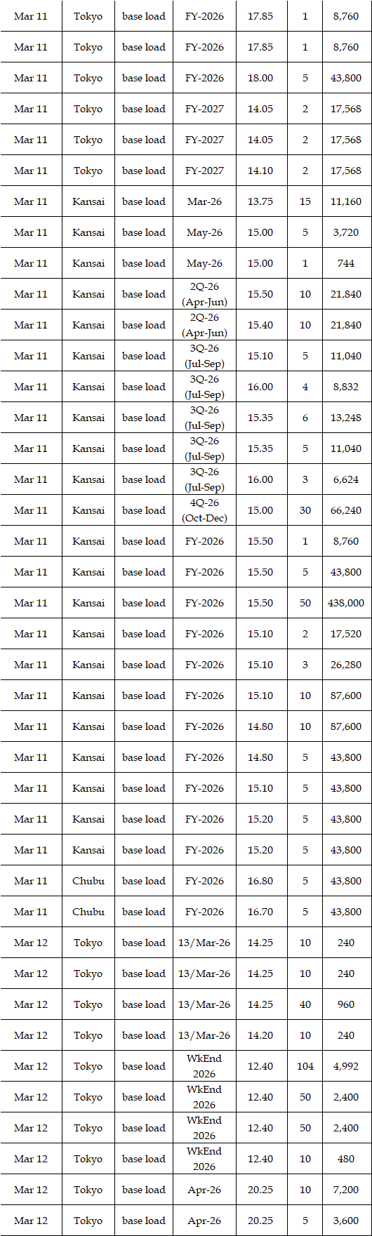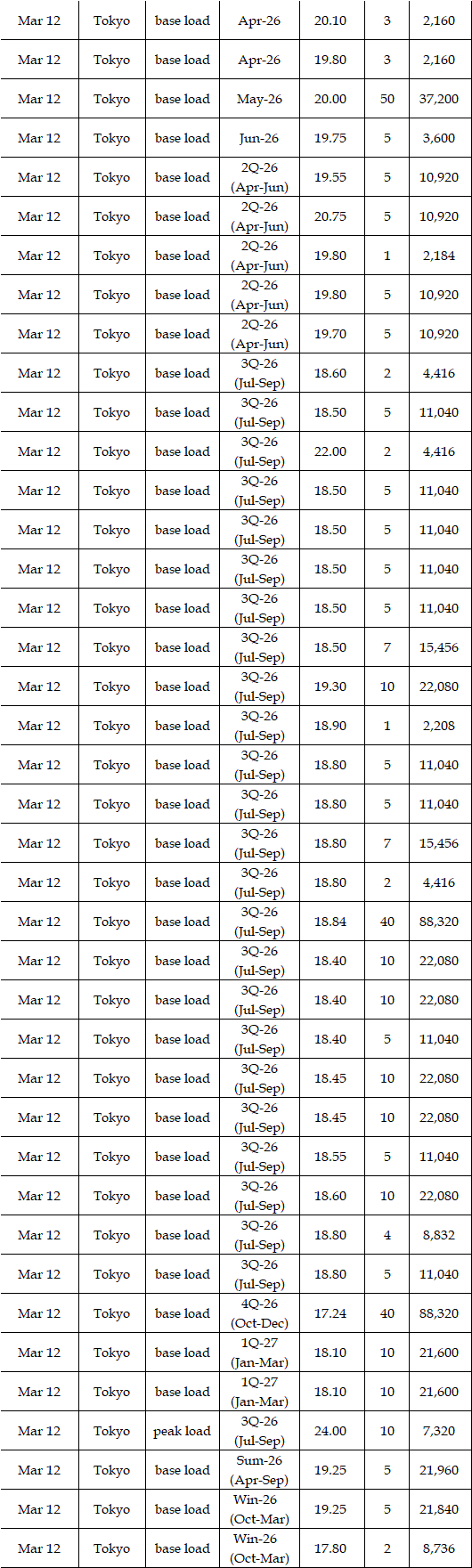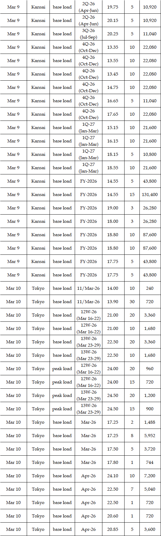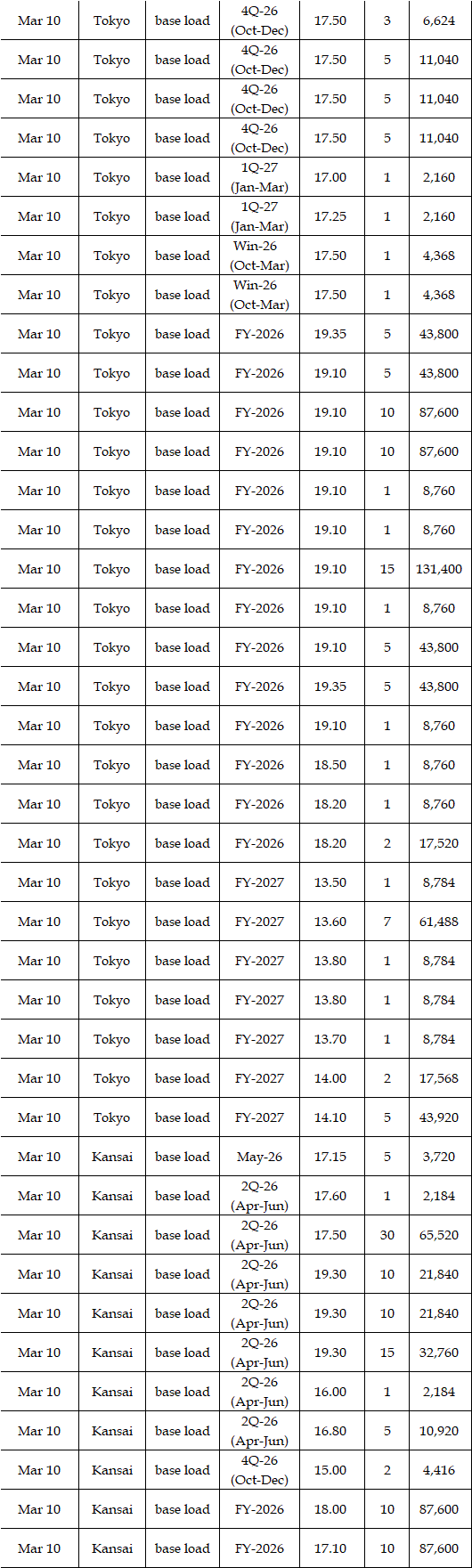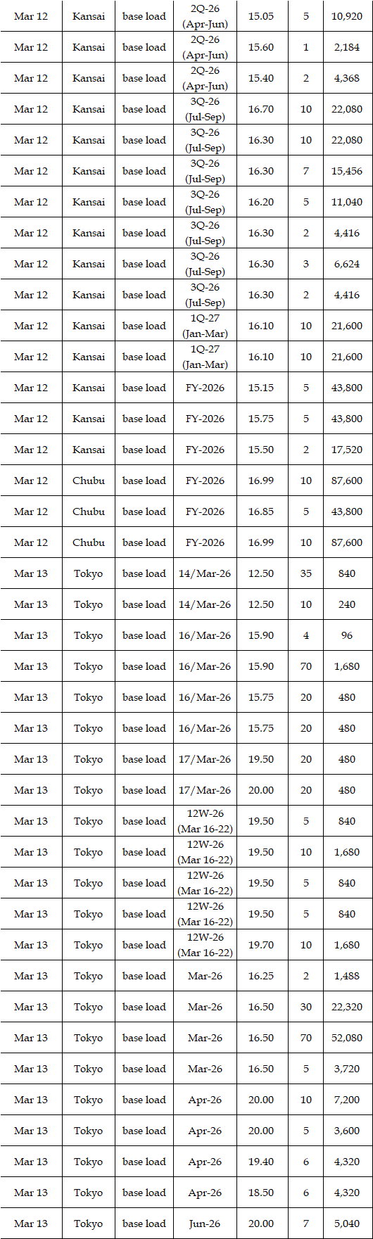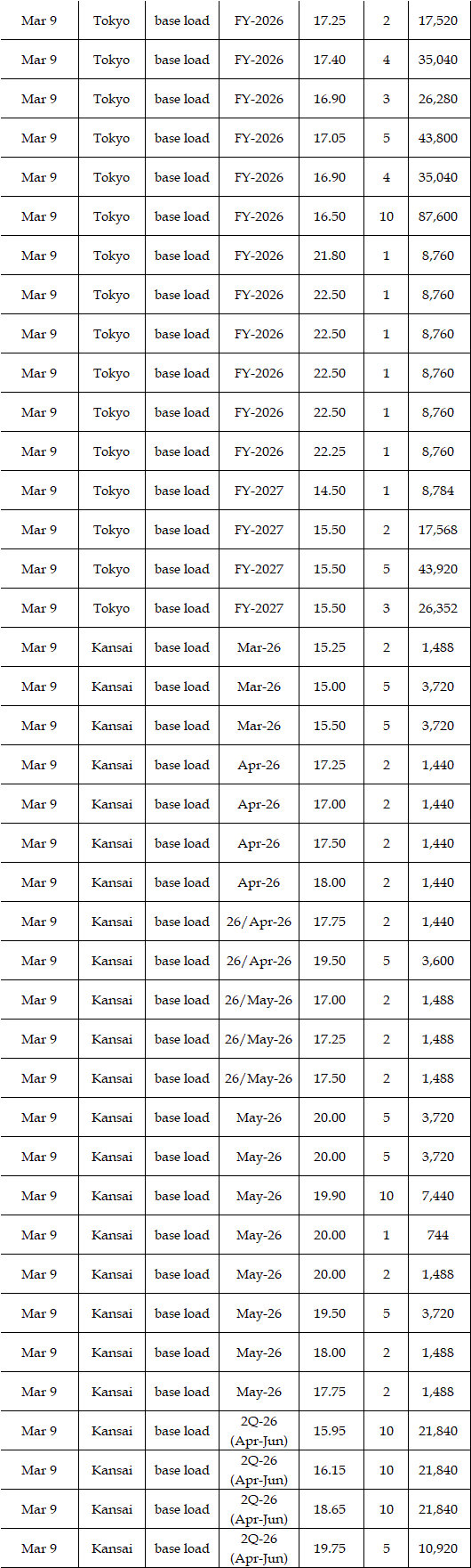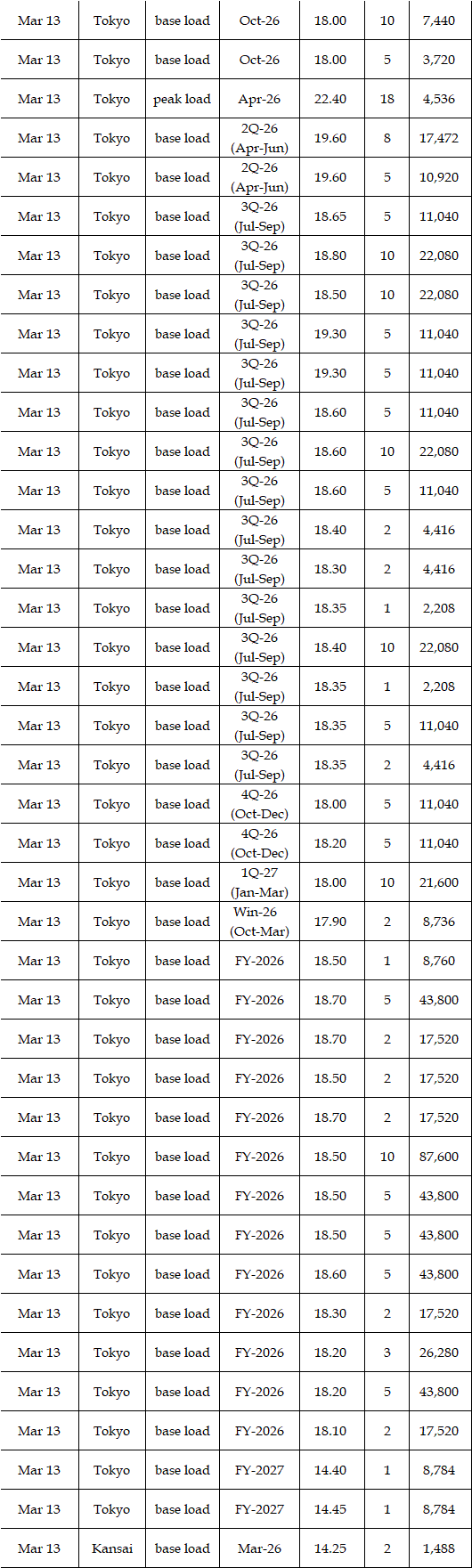 The actual highest price during the week was at Yen 25.12 in seven areas from Hokkaido through Chugoku on Mar 10; the actual lowest price during the week was at Yen 0.01 in Shikoku & Kyushu on Mar 9-11 and in Tohoku, Shikoku & Kyushu on Mar 12-13.