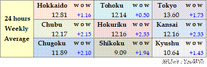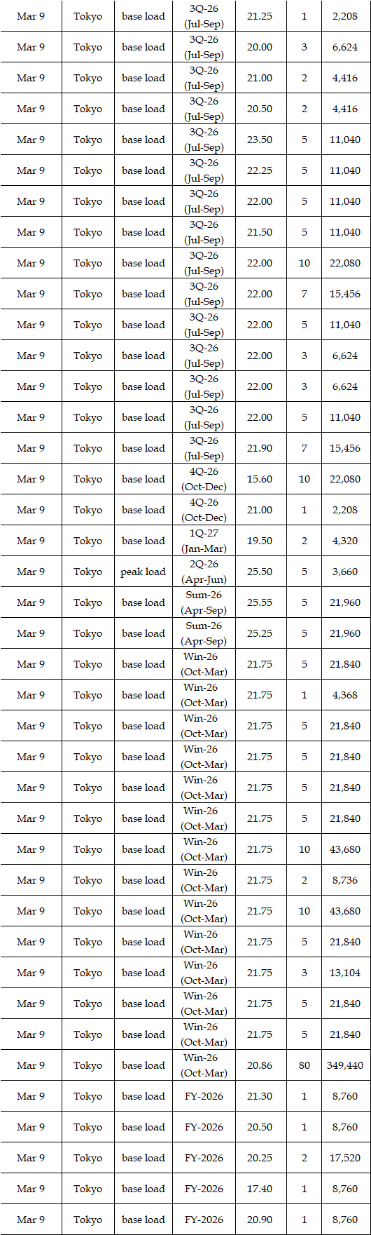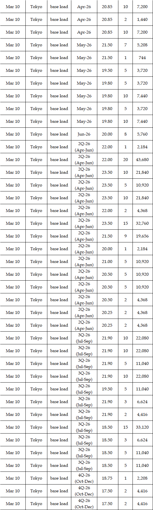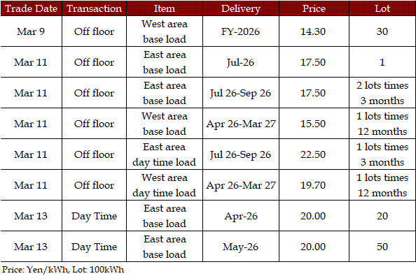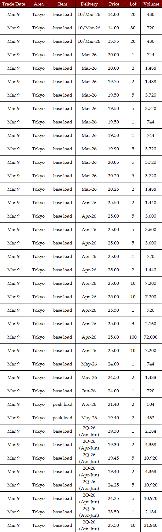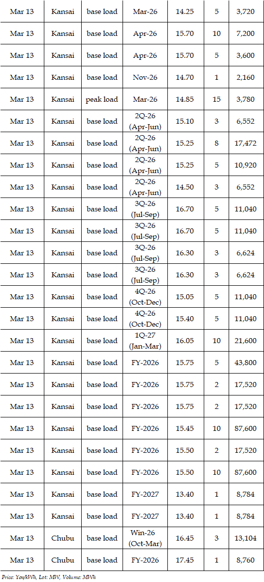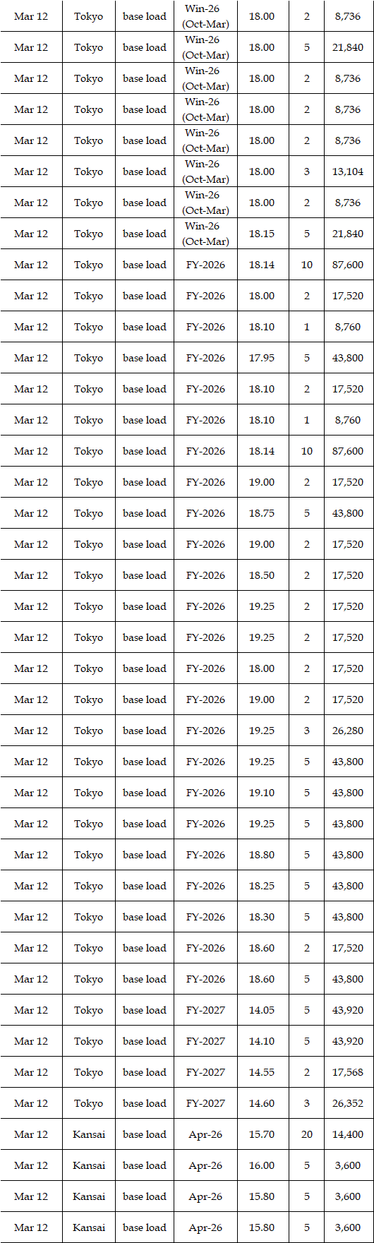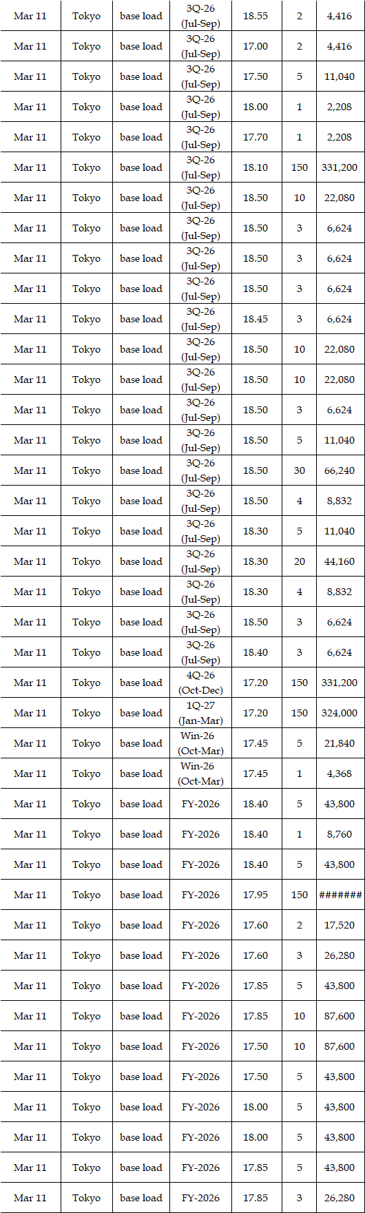 The actual highest price during the week was at Yen 25.12 in seven areas from Hokkaido through Chugoku on Mar 10; the actual lowest price during the week was at Yen 0.01 in Shikoku & Kyushu on Mar 9-11 and in Tohoku, Shikoku & Kyushu on Mar 12-13.