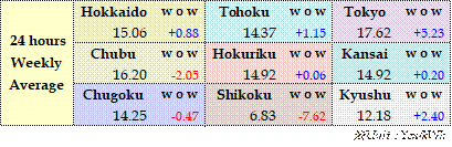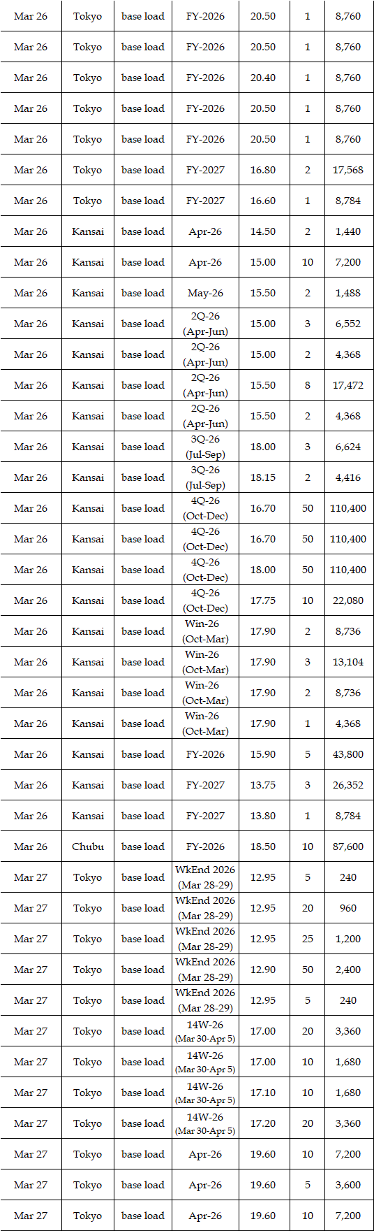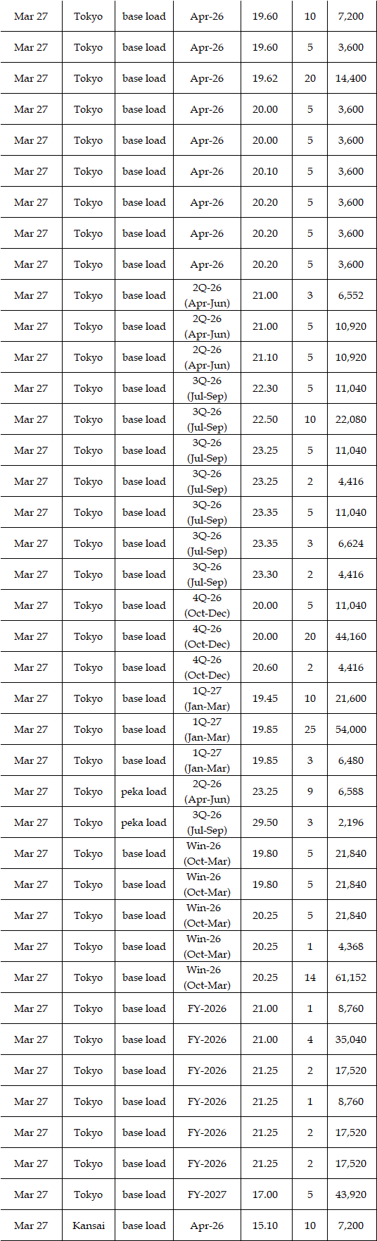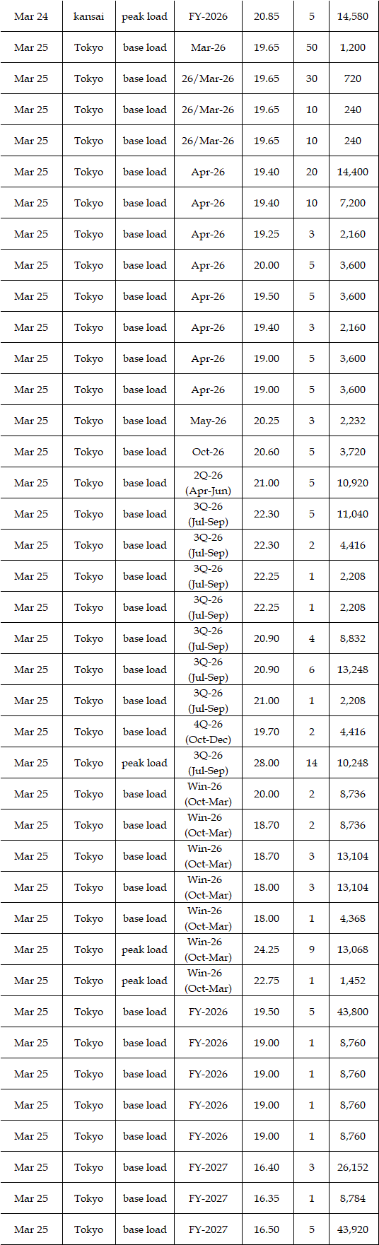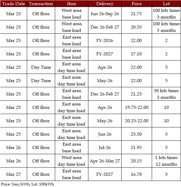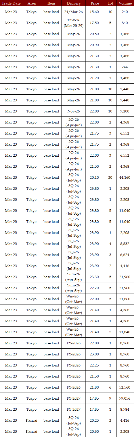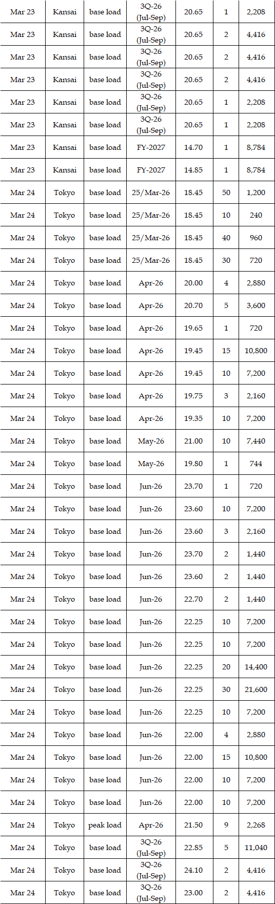 The actual highest price during the week was at Yen 24.60 in four areas from Tokyo through Kansai on Mar 26; the actual lowest price during the week was at Yen 0.01 in Shikoku & Kyushu on Mar 23, in Hokkaido & Tohoku on Mar 24, in Shikoku & Kyushu on Mar 26, and in three areas from Chugoku through Kyushu on Mar 27.