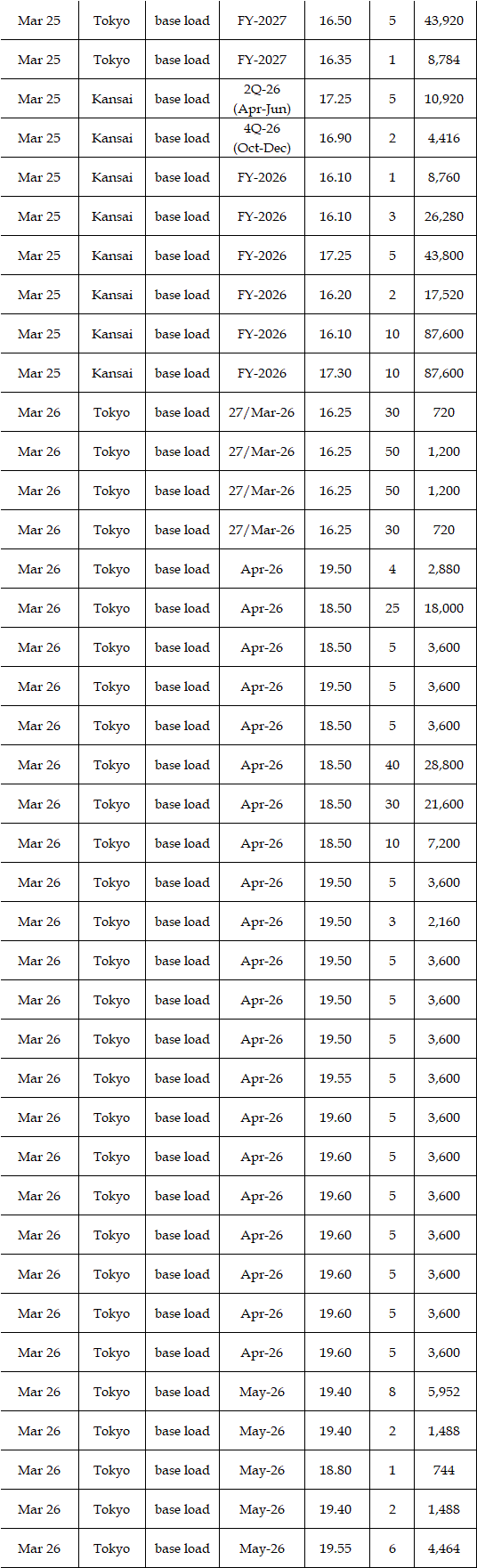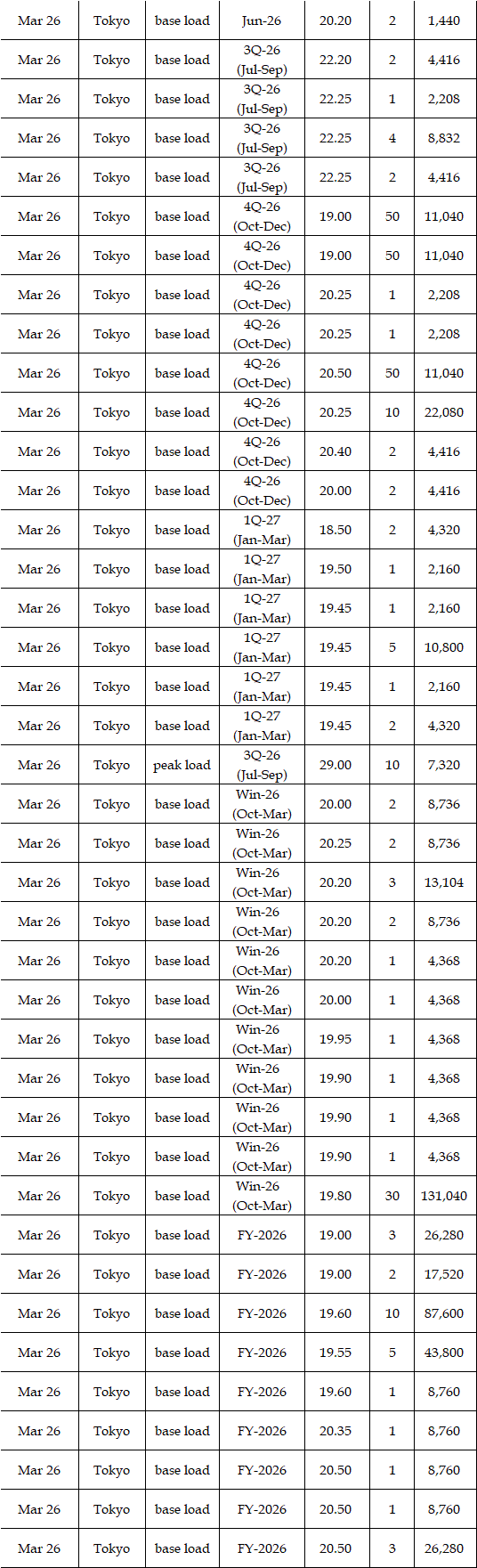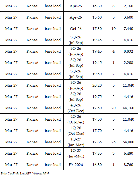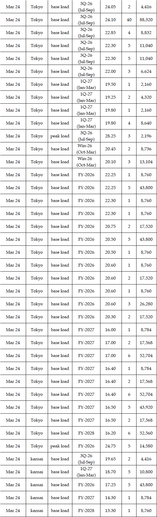 The spread of the 24-hour spot average between Tokyo and Kansai, a major market area in East and West Japan, was Yen 3.57 on Mar 23, Yen 0.83 on Mar 24, Yen 1.65 on Mar 25, Yen 2.15 on Mar 26, and Yen 5.43 in Mar 27 in favor of Tokyo.