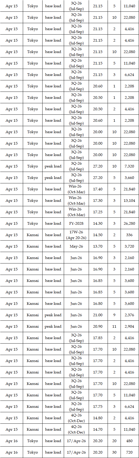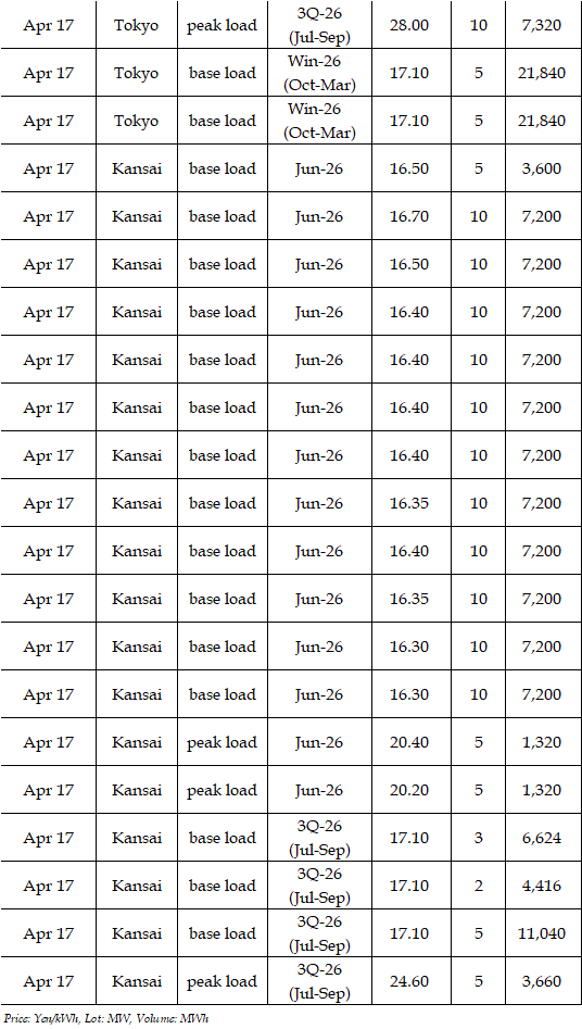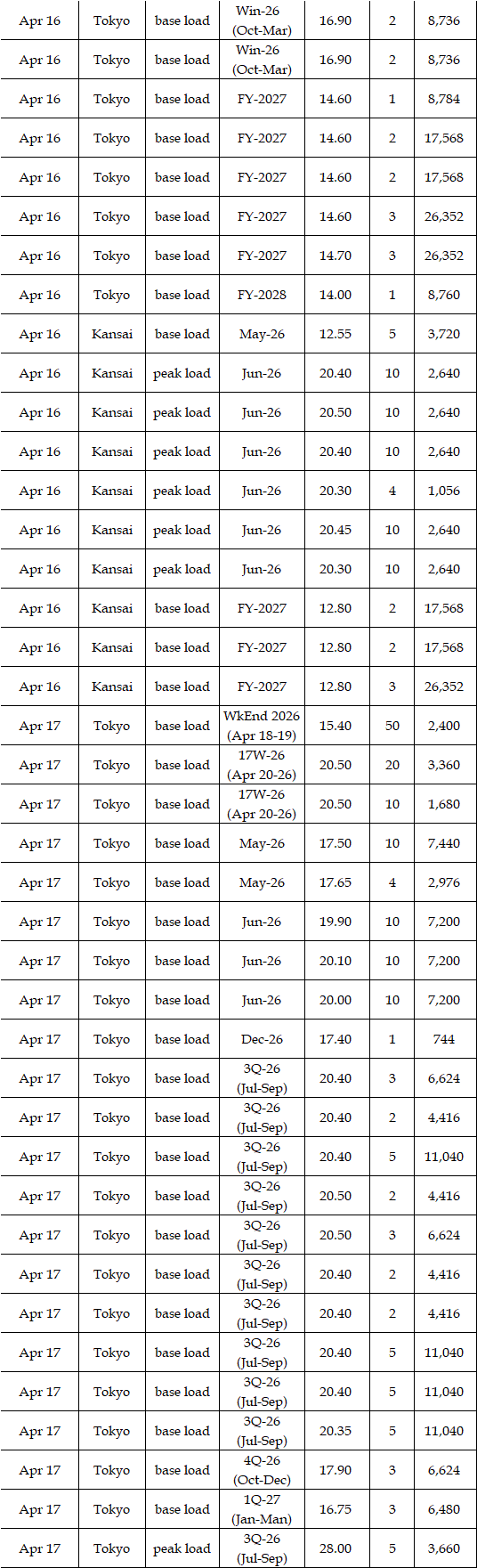 Looking at the spread in 24-hour average power spot prices between Tokyo and Kansai, the major East and West areas, the East-West spread was Yen 6.01 in favor of the East on Apr 13, Yen 6.04 on Apr 14, Yen 2.33 on Apr 15, Yen 10.44 on Apr 16, and Yen 10.60 in favor of the East on Apr 17, with the East-West spread remaining significantly diverged.