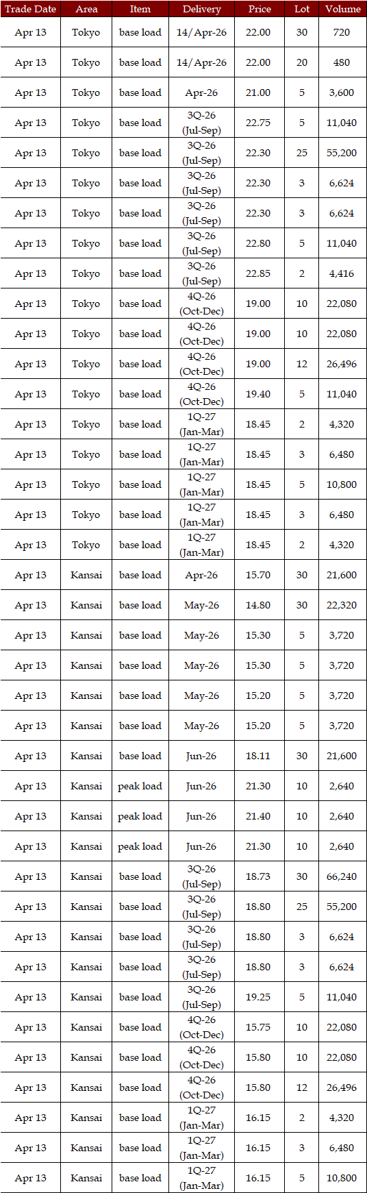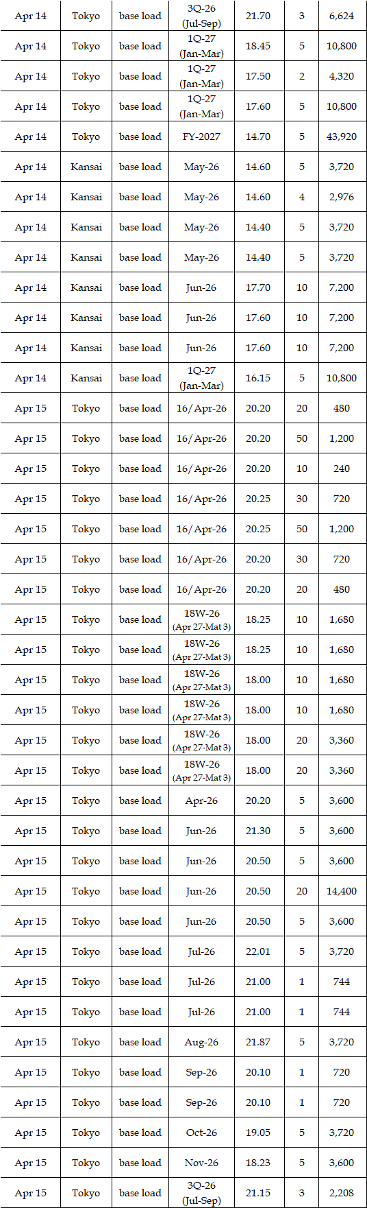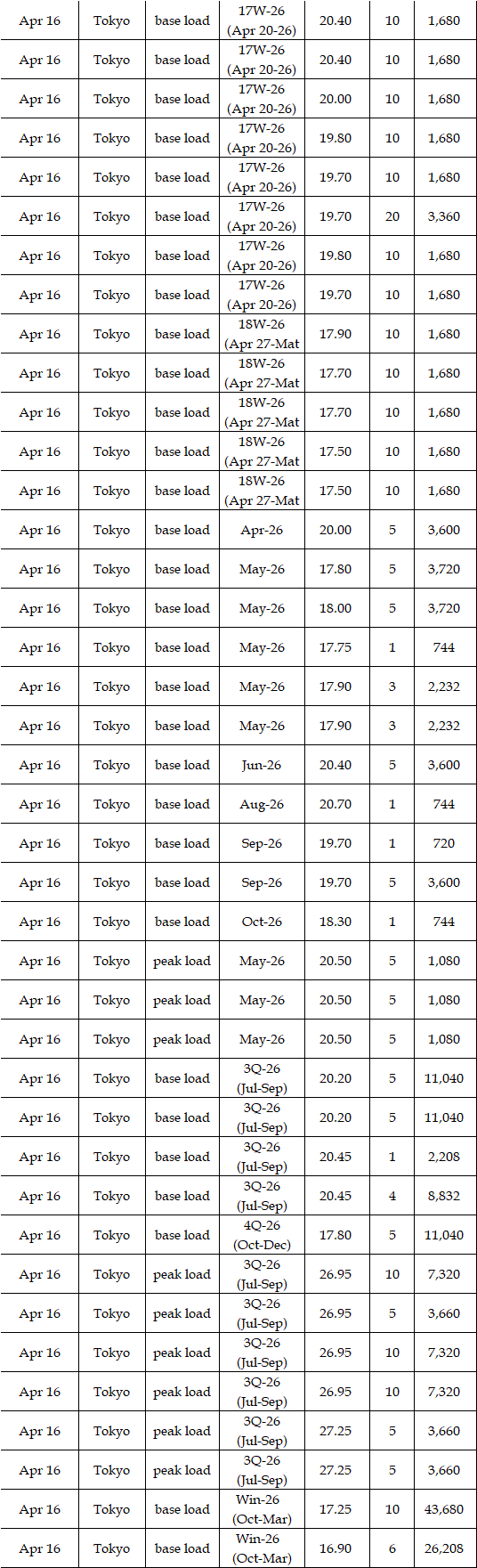 For Apr 13-17 delivery, the 24-hour average of power spot prices in both East Japan (50Hz) and West Japan (60Hz) retreated from the previous week. On the back of increased solar power generation compared to the previous week, there were more days when prices slumped to an extremely low Yen 0.01 during daytime hours, weighing on the overall 24-hour average. However, prices in the evening and nighttime hours continued to feature elevated prices, as high fuel costs and purchasing by major utilities had a significant impact. Especially in Tokyo, the base price never fell below Yen 20 throughout the week, and with some days seeing prices exceed Yen 50, days of uniquely high prices continued. Many market participants continued to believe that purchasing by major utilities significantly impacted prices. Many now view this trend as likely to continue into next week and beyond.