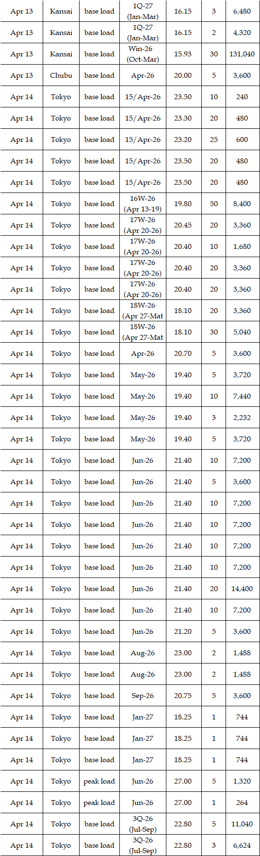 Deals reported on EEX (European Energy Exchange) during Apr 13-17 were as below.
