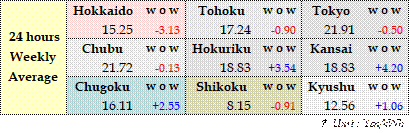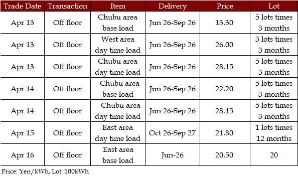 The actual highest price during the week was at Yen 57.88 in Tokyo on Apr 16; the actual lowest price during the week was at Yen 0.01 in Hokkaido, Tohoku & Shikoku on Apr 13; in Hokkaido & Tohoku on Apr 14; in all of nine areas & system price on Apr 16; and in Hokkaido & Tohoku on Apr 17.